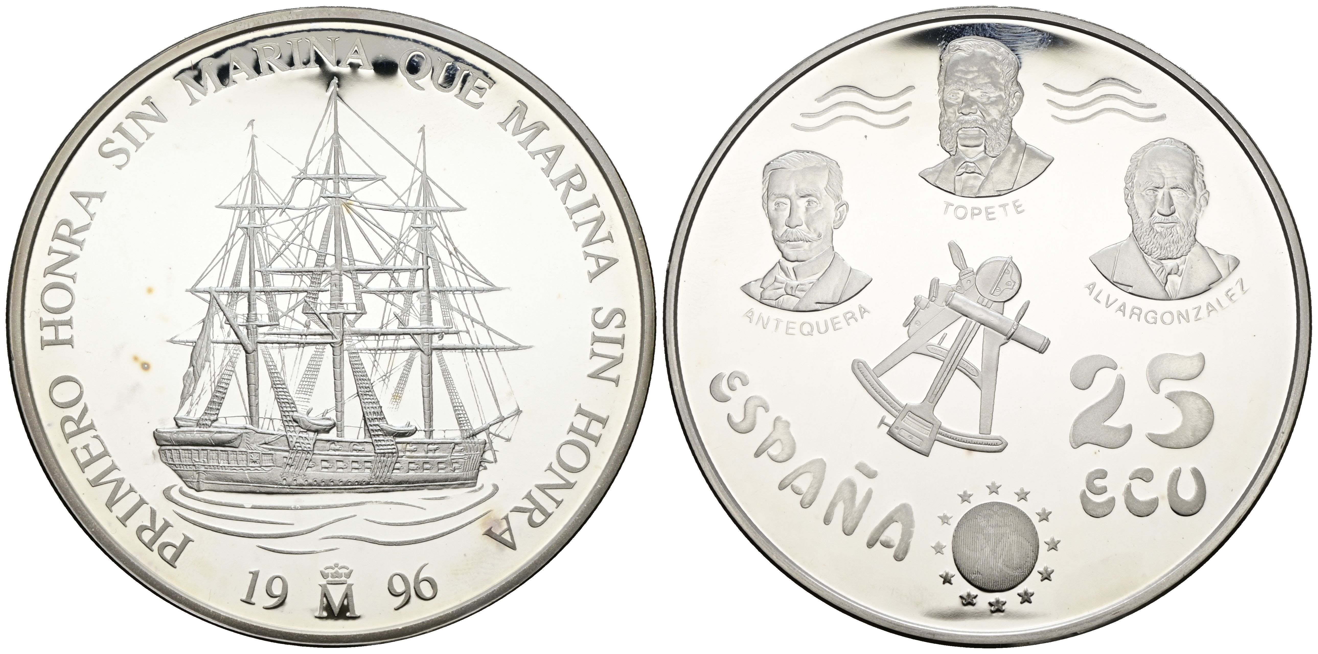 JUAN CARLOS I. 25 Ecu. (Ar. 168,60g/73mm). 1996. Serie de la Marina Española. Villa de Madrid. PROOF.