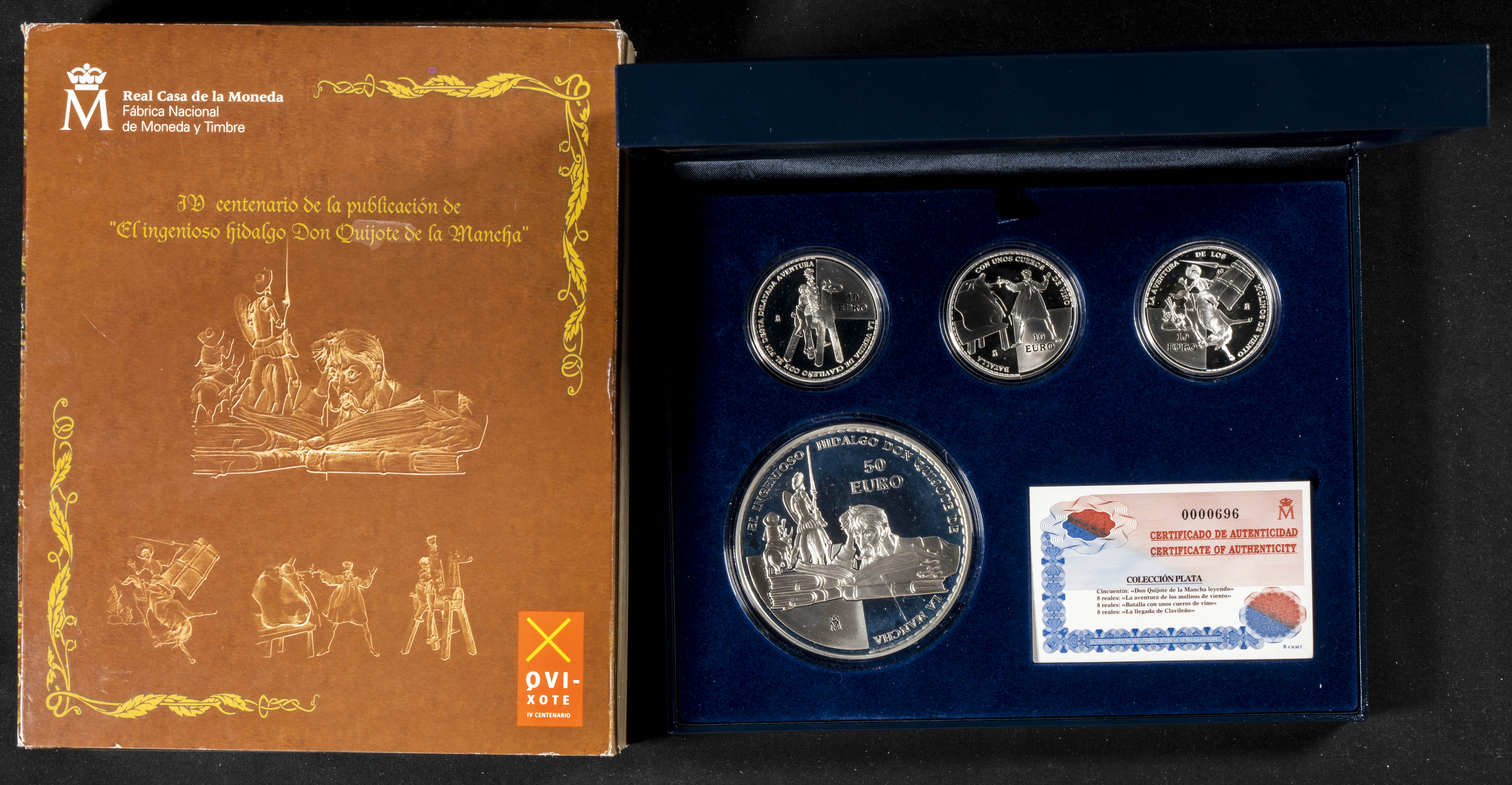JUAN CARLOS I (1975-2014). Serie Don Quijote de la Mancha. Serie completa en plata. 4 valores: 50 Euro (1) y 10 Euro (3). 2005. FNMT. PROOF. Peso total en plata aproximadamente: 250g. Incluye estuche original y certificado de autenticidad.