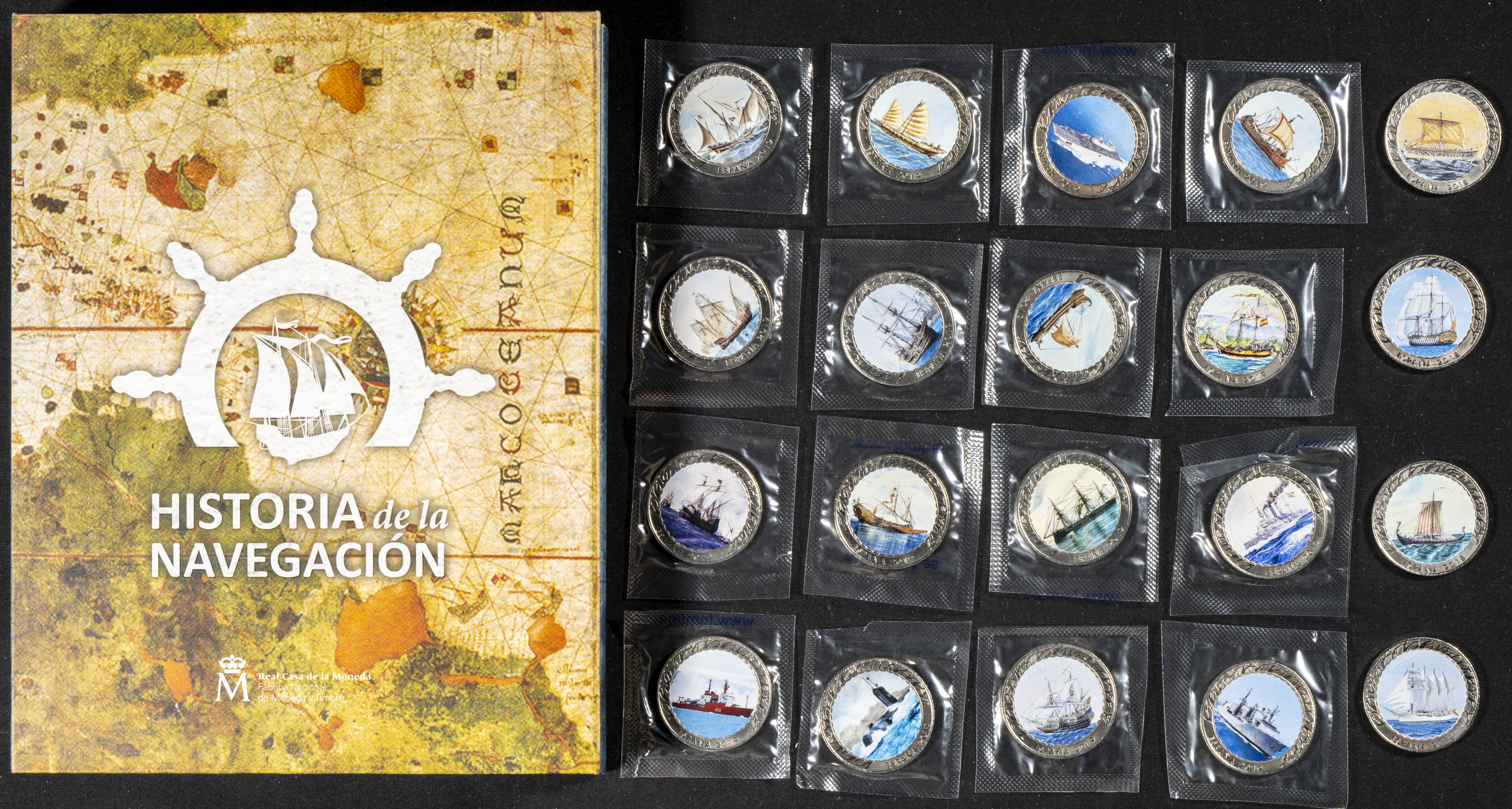 FELIPE VI (2014-?). Set completo de 20 monedas en cupro-niquel, con valor facial de 1,5 Euros y perteneciente a la Serie Historia de la Navegación. 2018. FNMT. Estuche oficial incluyendo libreto explicativo. La mayoría de las piezas se presentan en su blister original sin abrir. Tirada de 10.000 ejemplares. Perfecto estado de conservación. A EXAMINAR.