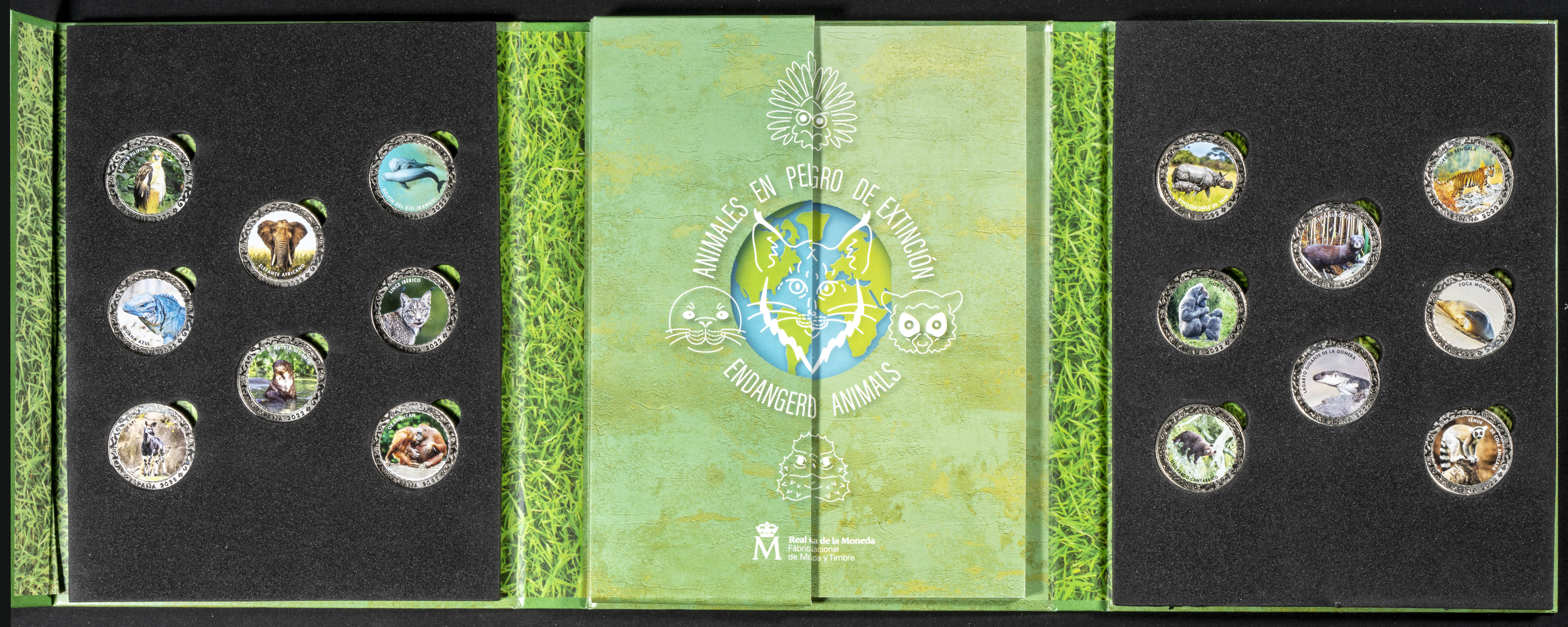 FELIPE VI (2014-?). Set completo de 16 monedas en cupro-niquel, con valor facial de 1,5 Euros y perteneciente a la Serie Animales en Peligro de Extinción. 2022. FNMT. Estuche oficial incluyendo libreto explicativo. Tirada de 5000 ejemplares. Perfecto estado de conservación. A EXAMINAR.