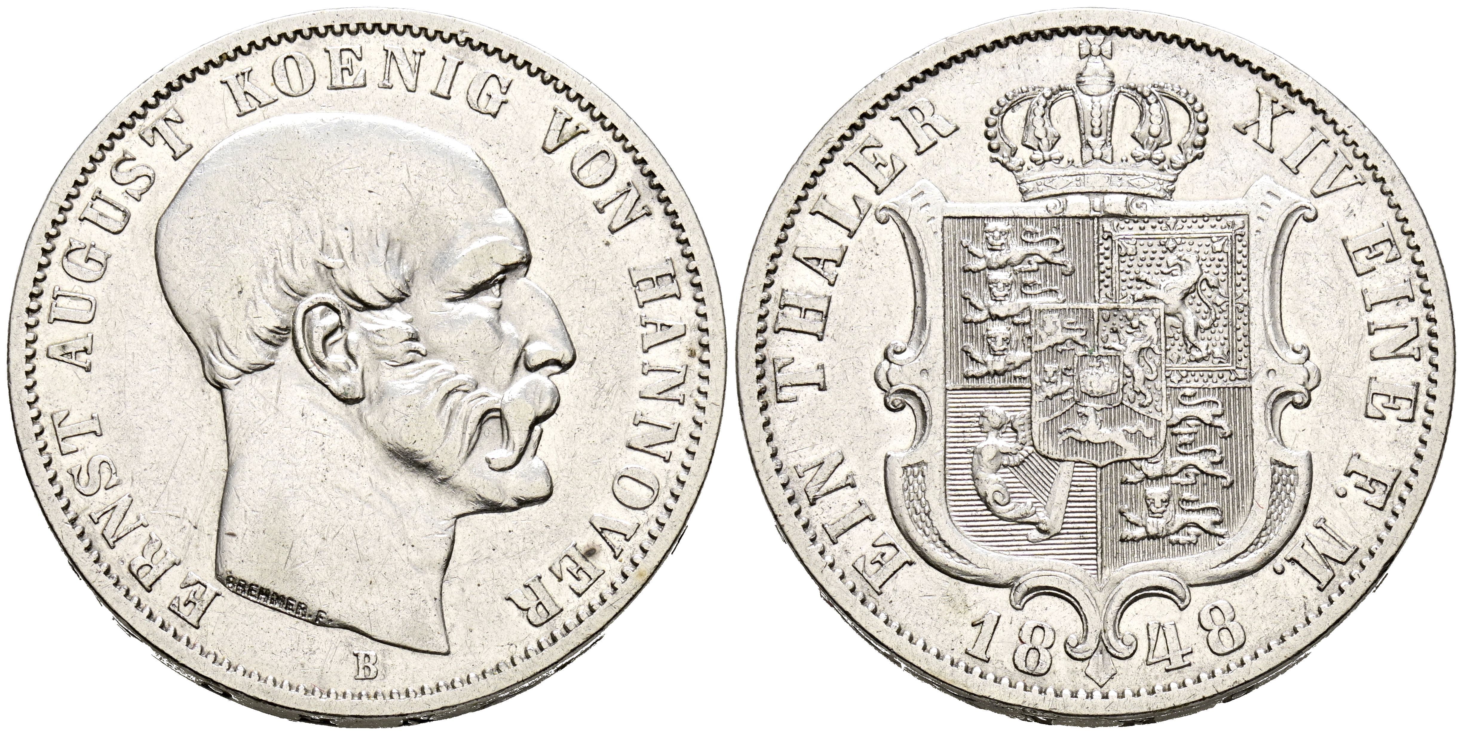 ALEMANIA, Ernesto Augsto I. Táler. (Ar. 22,14g/34mm). 1848. Hannover B. (Davenport 675). MBC/MBC+.