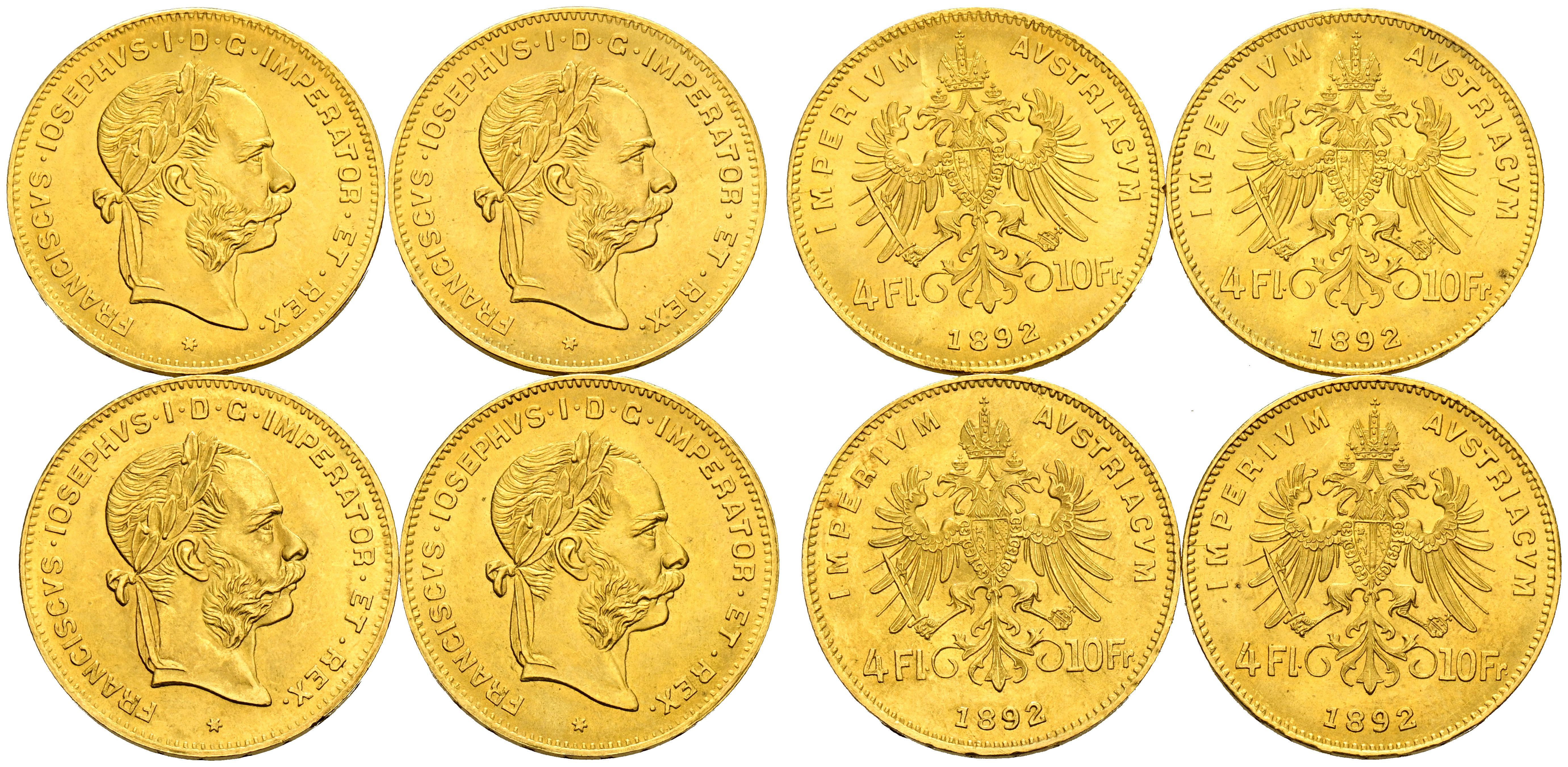 AUSTRIA, Francisco José I (1848-1916). Conjunto de 4 reacuñaciones de 4 Florines de 1892. Peso total del conjunto: 12,89g. Pureza del oro: 0,870 milésimas. A EXAMINAR.