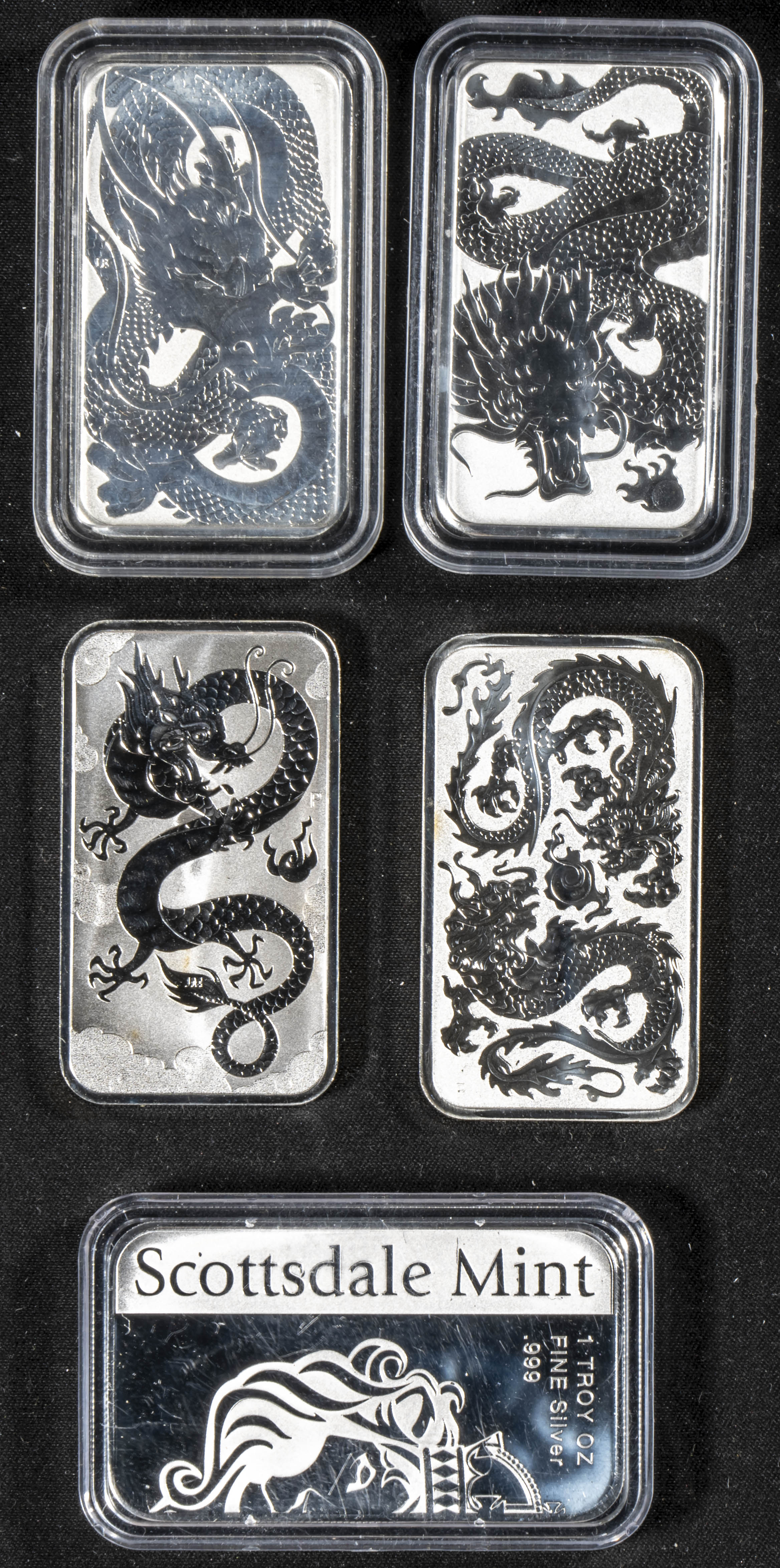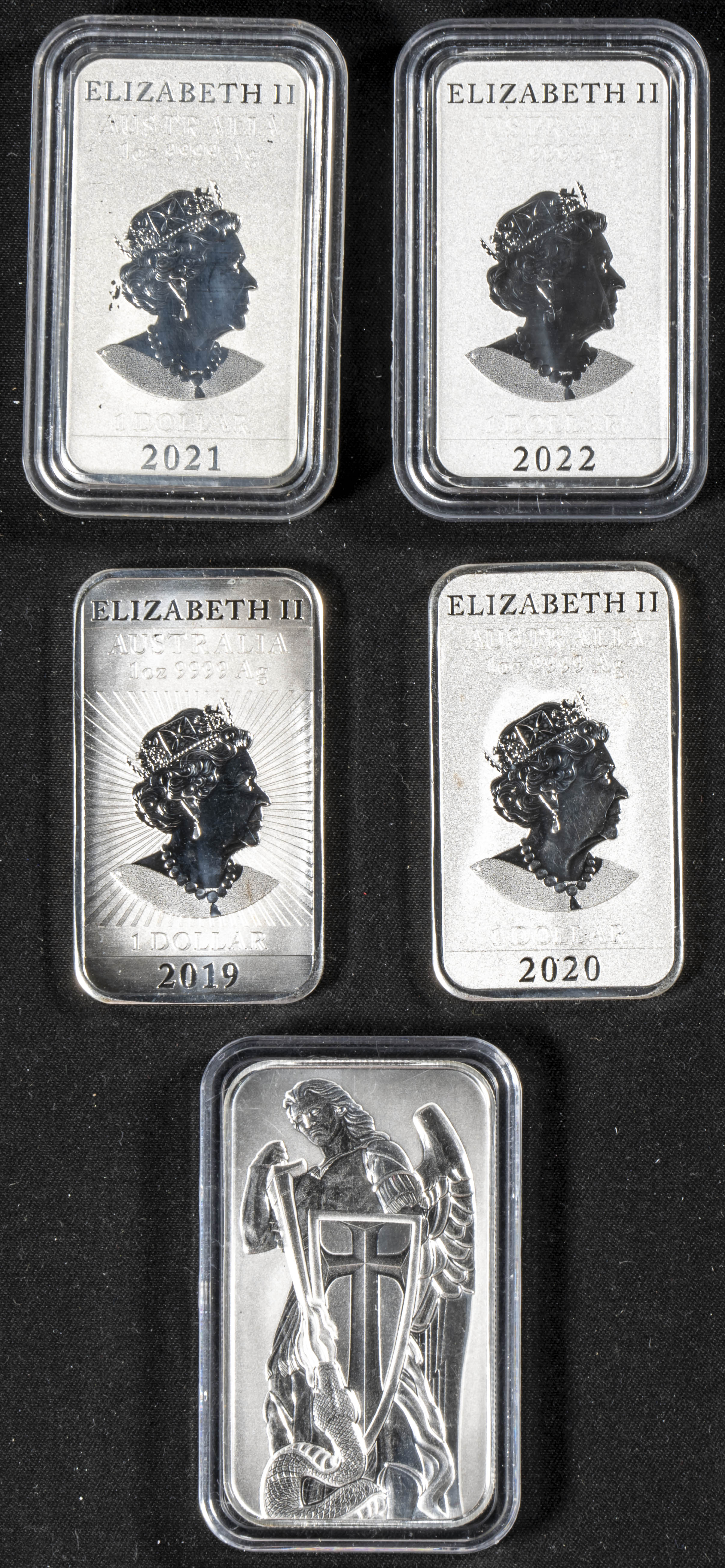 AUSTRALIA. Conjunto de 4 piezas rectangulares de 1 Dollar en plata pura de los años: 2019,2020, 2021 y 2022 y 1 Onza rectangular de plata. PROOF. Se incluyen 3 cápsulas. A EXAMINAR.