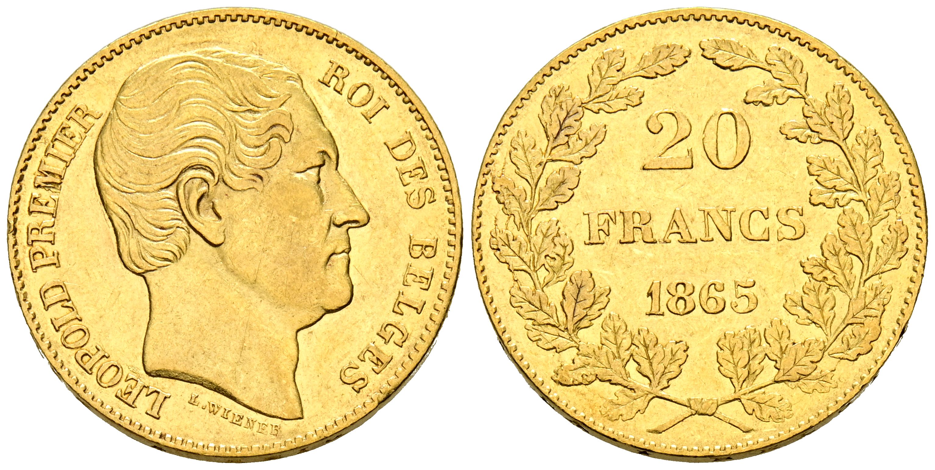 BELGICA, Leopoldo I (1831-1865). 20 Francos. (Au. 6,45g/21mm). 1865. Bruselas. (Km#23). MBC+.