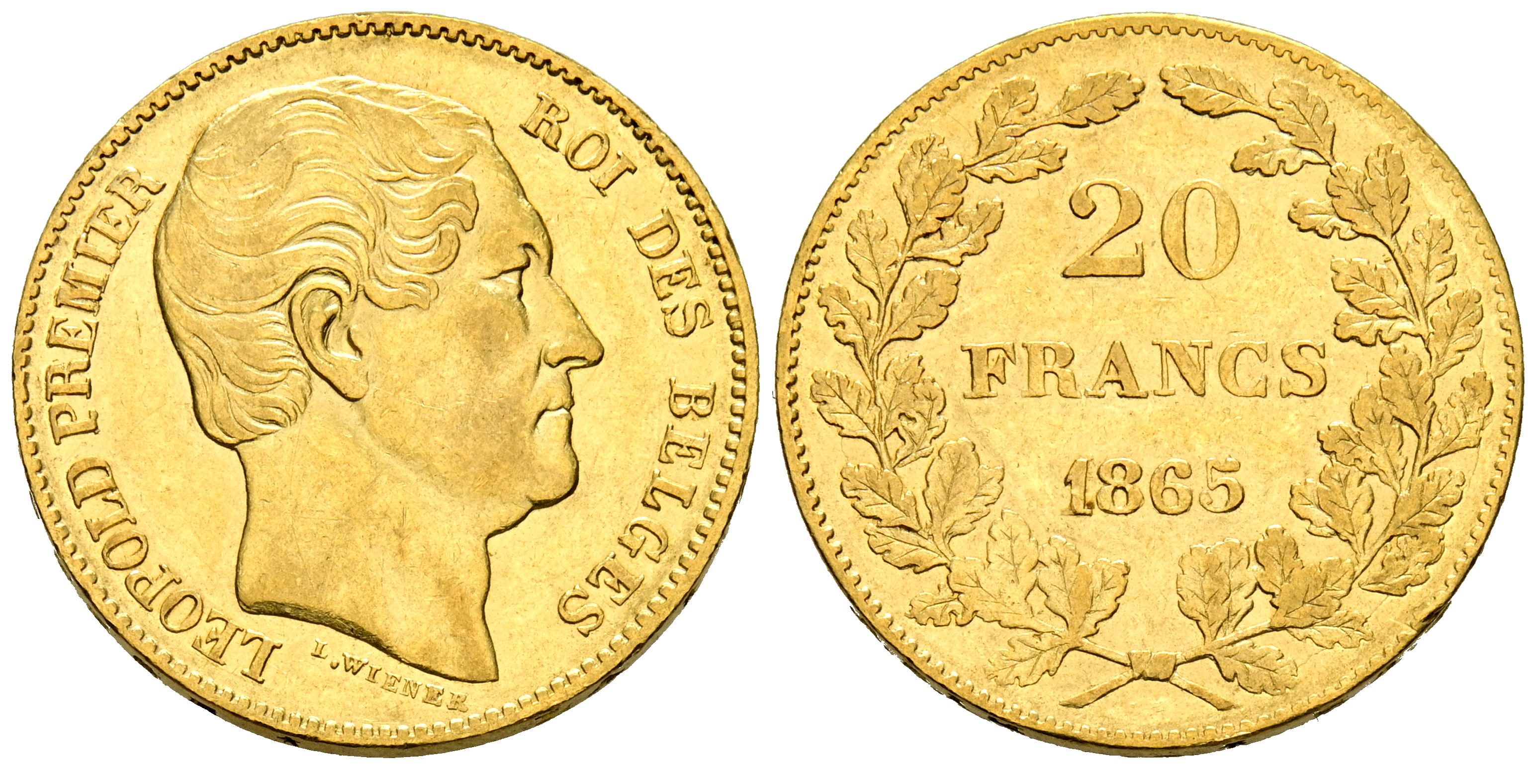 BELGICA, Leopoldo I (1831-1865). 20 Francos. (Au. 6,44g/21mm). 1865. Bruselas. (Km#23). MBC.