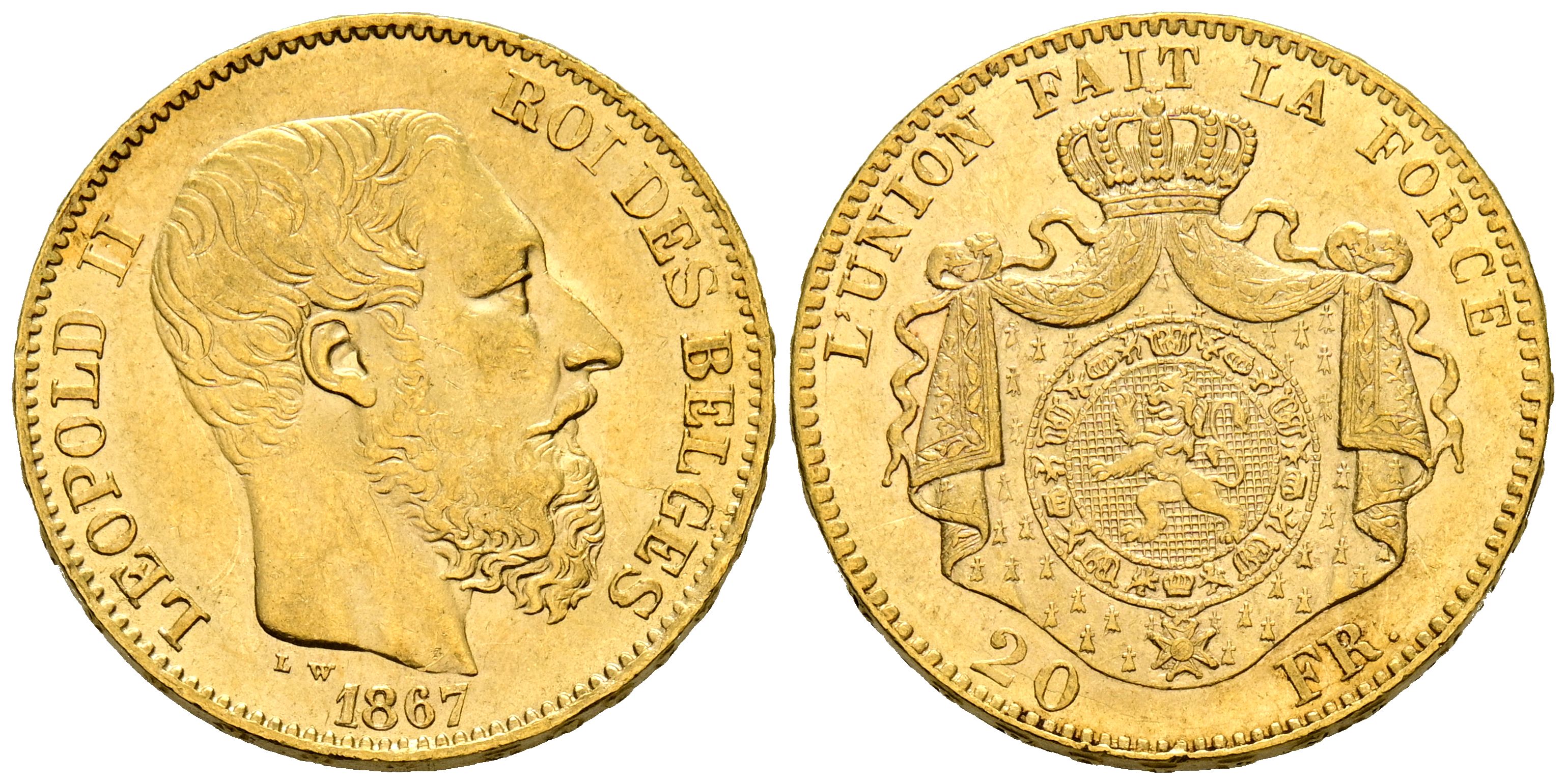 BELGICA, Leopoldo II (1865-1909). 20 Francos. (Au. 6,46g/21mm). 1867. Bruselas. (Km#32). MBC.