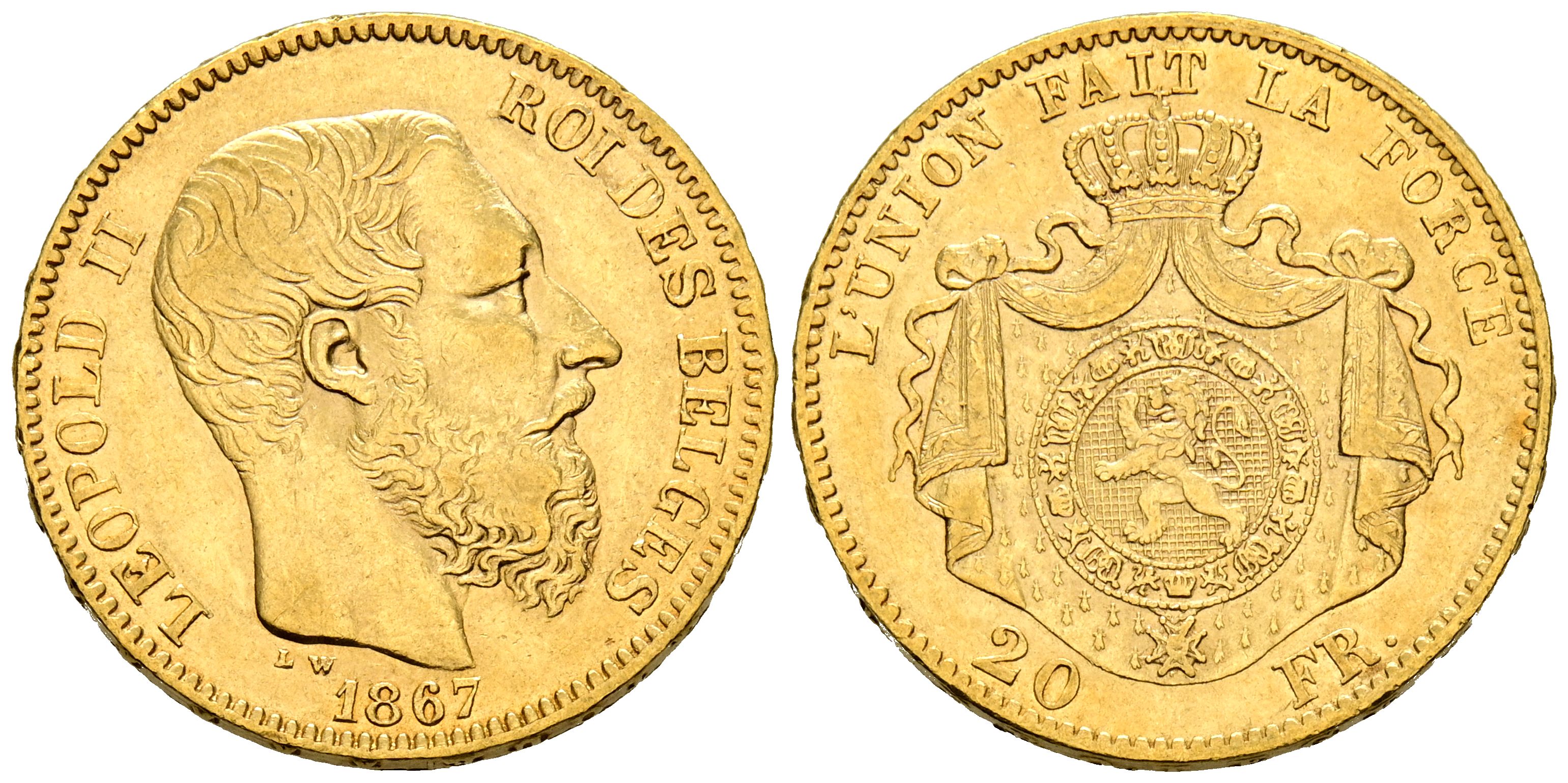 BELGICA, Leopoldo II (1865-1909). 20 Francos. (Au. 6,39g/21mm). 1867. Bruselas. (Km#32). MBC.