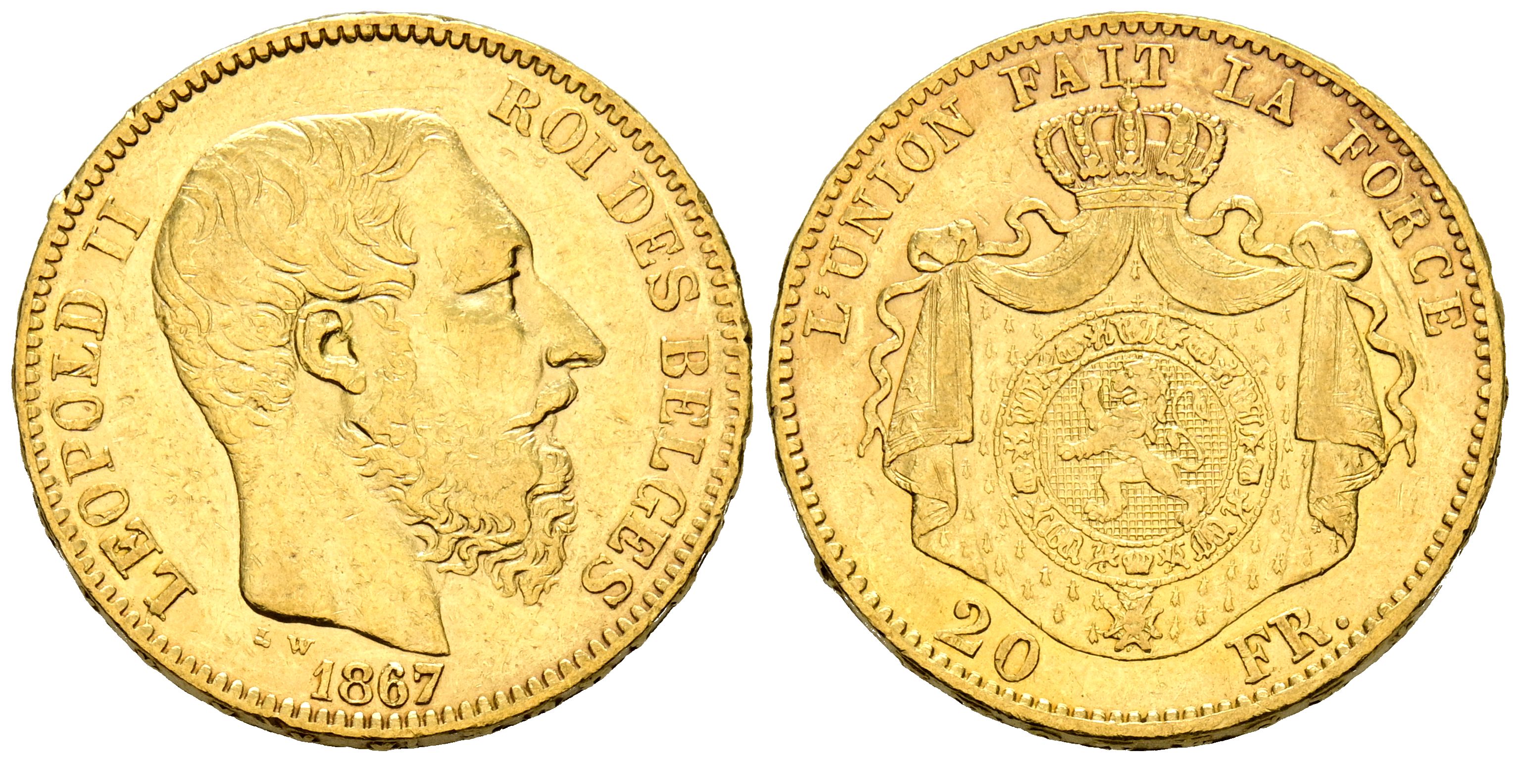 BELGICA, Leopoldo II (1865-1909). 20 Francos. (Au. 6,43g/21mm). 1867. Bruselas. (Km#32). MBC-.