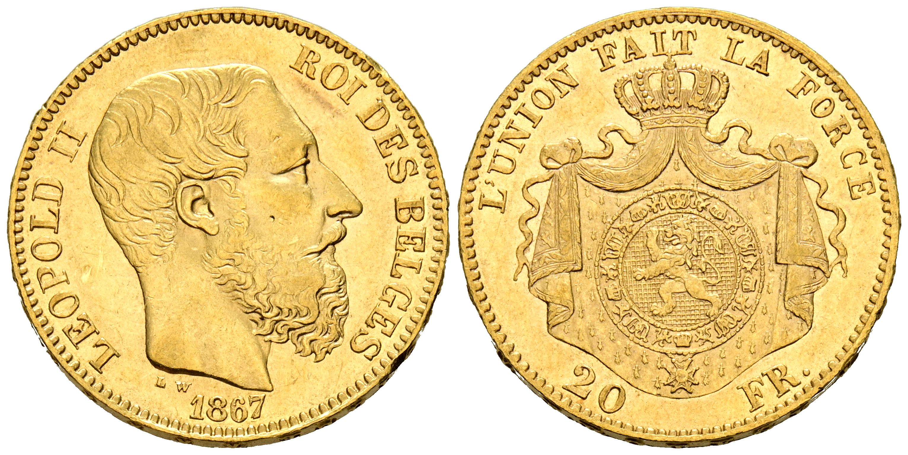 BELGICA, Leopoldo II (1865-1909). 20 Francos. (Au. 6,45g/21mm). 1867. Bruselas. (Km#32). MBC+. Golpe en reverso.
