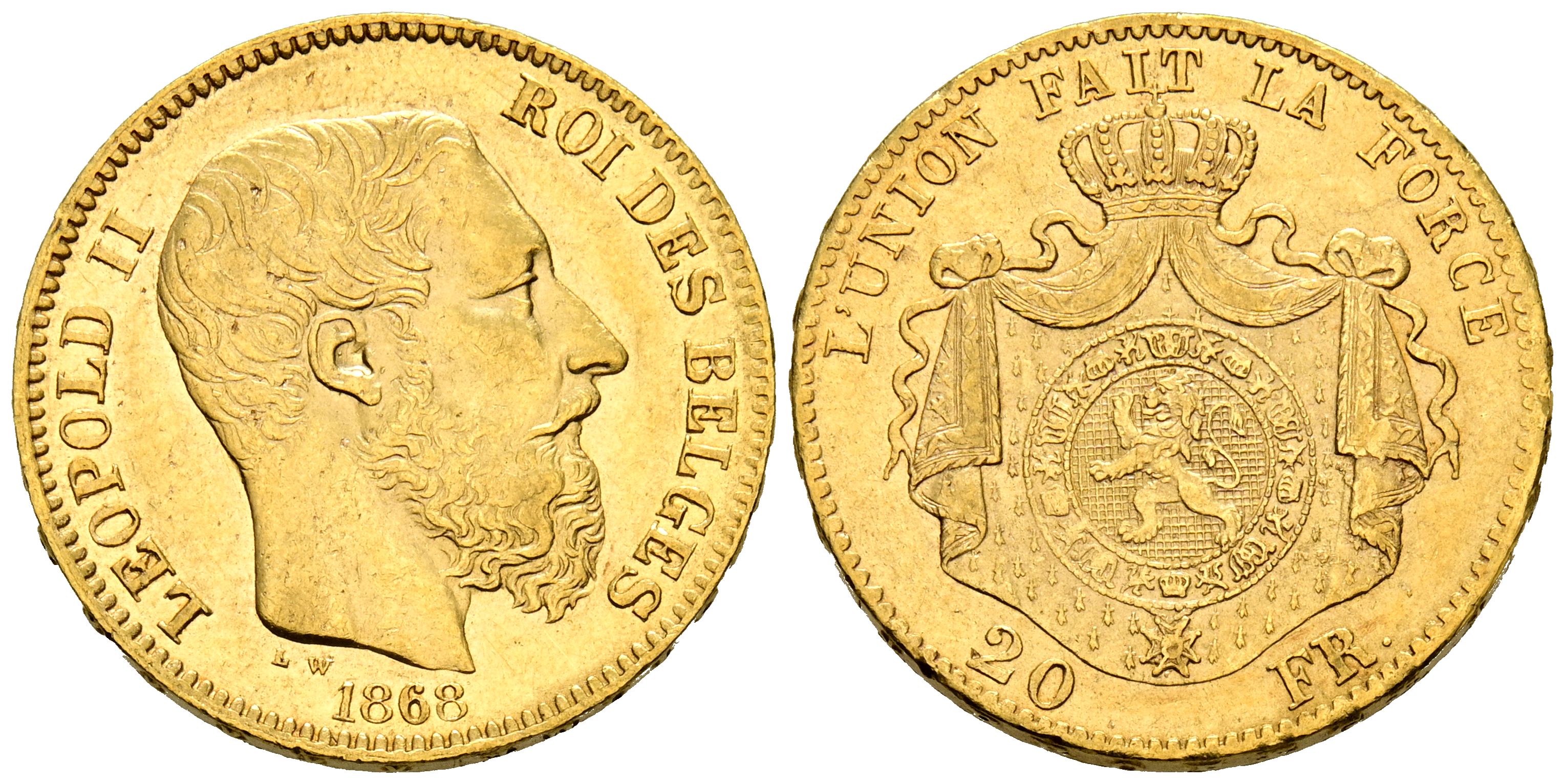 BELGICA, Leopoldo II (1865-1909). 20 Francos. (Au. 6,44g/21mm). 1868. Bruselas. (Km#32). MBC+/MBC.