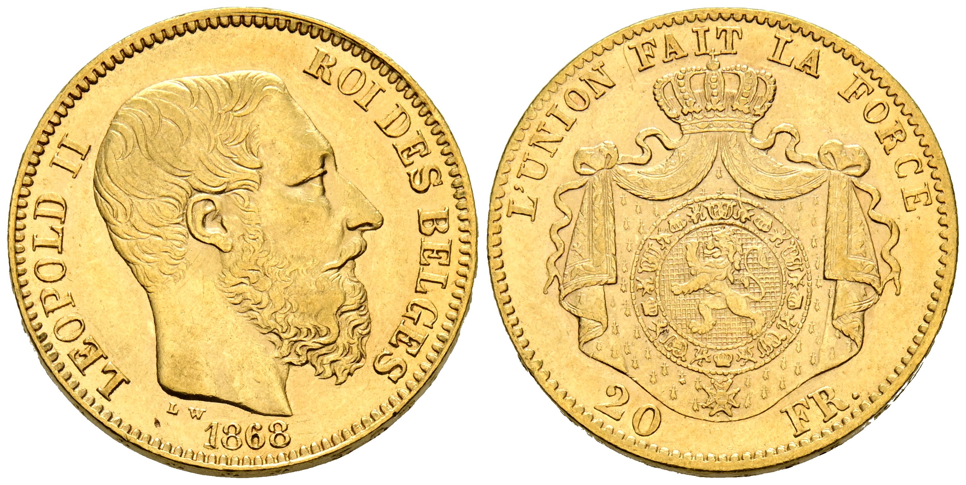 BELGICA, Leopoldo II (1865-1909). 20 Francos. (Au. 6,43g/21mm). 1868. Bruselas. (Km#32). MBC.