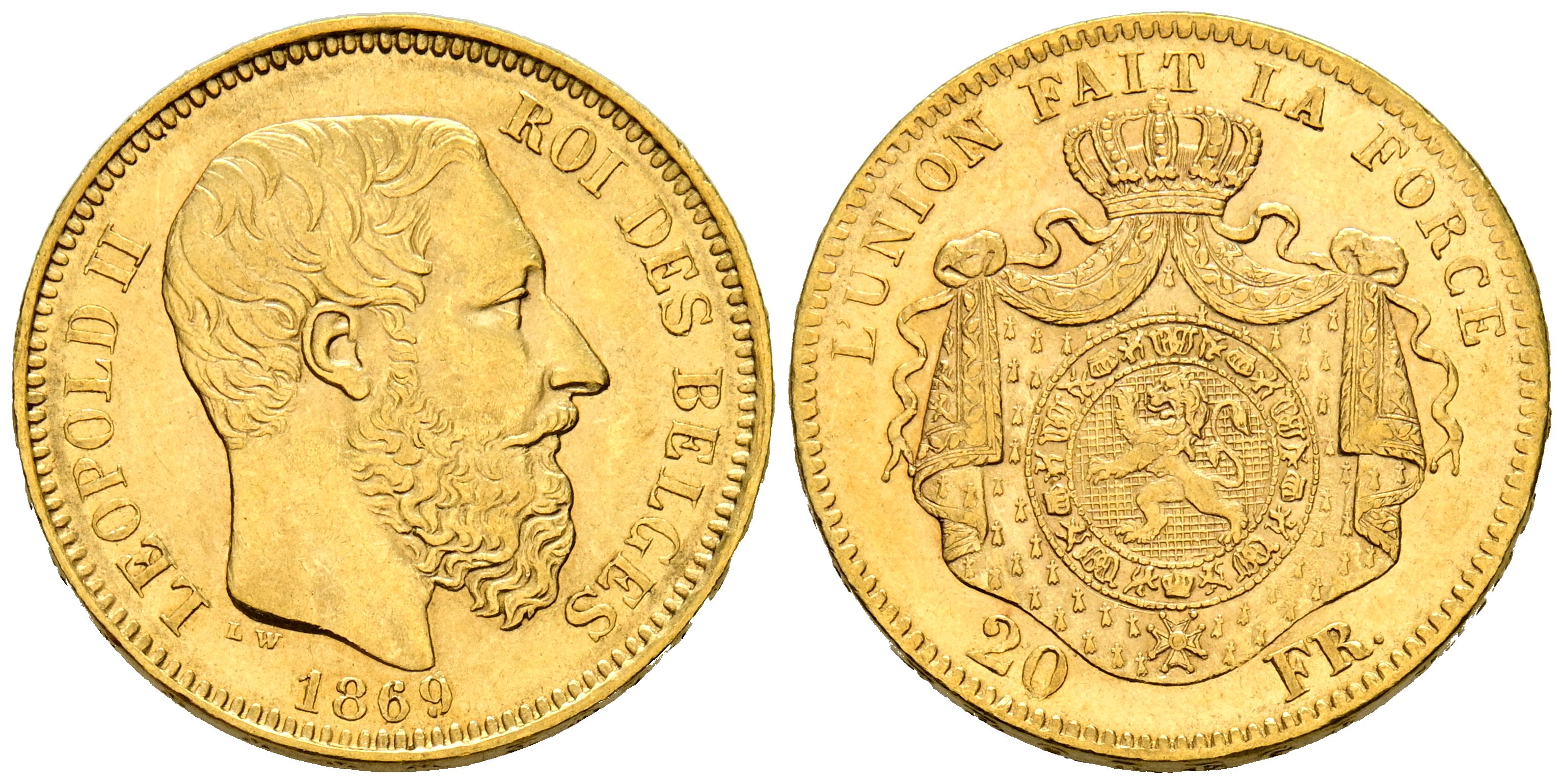 BELGICA, Leopoldo II (1865-1909). 20 Francos. (Au. 6,47g/21mm). 1869. Bruselas. (Km#32). MBC+.
