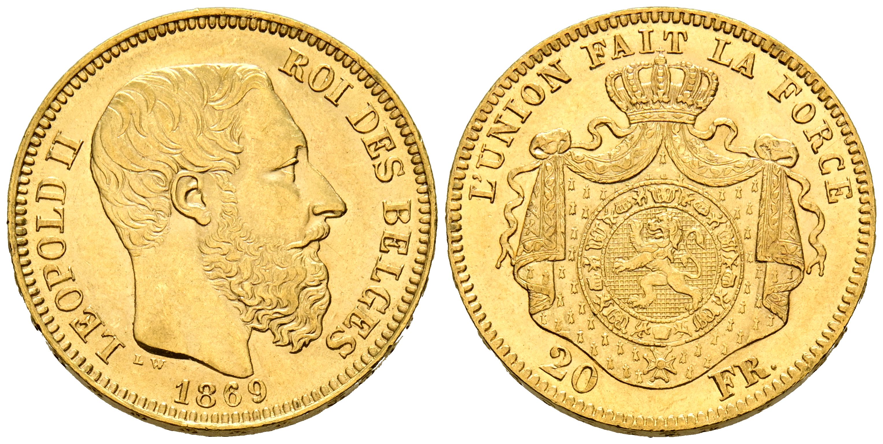 BELGICA, Leopoldo II (1865-1909). 20 Francos. (Au. 6,45g/21mm). 1869. Bruselas. (Km#32). MBC+.