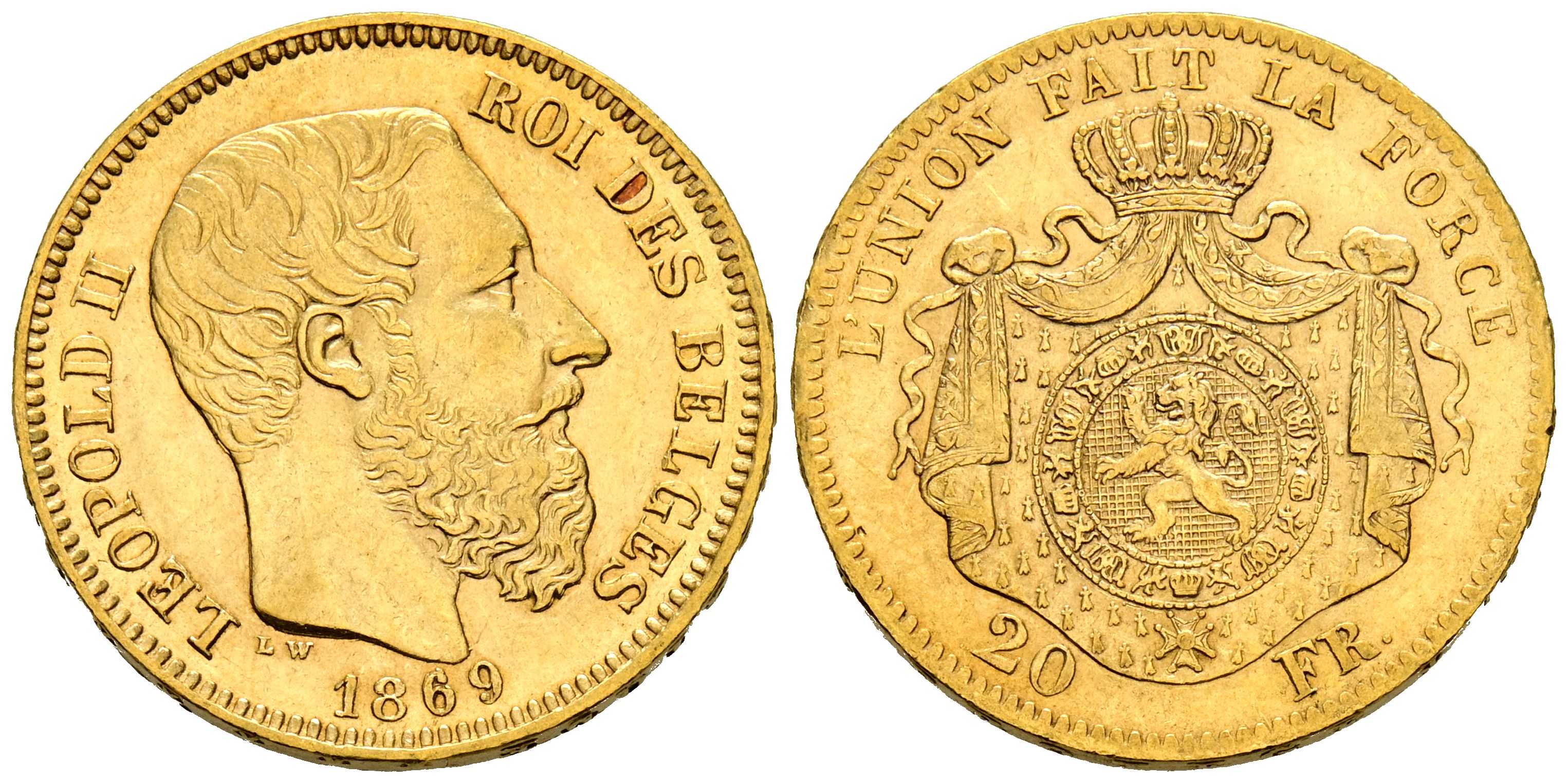 BELGICA, Leopoldo II (1865-1909). 20 Francos. (Au. 6,45g/21mm). 1869. Bruselas. (Km#32). MBC.