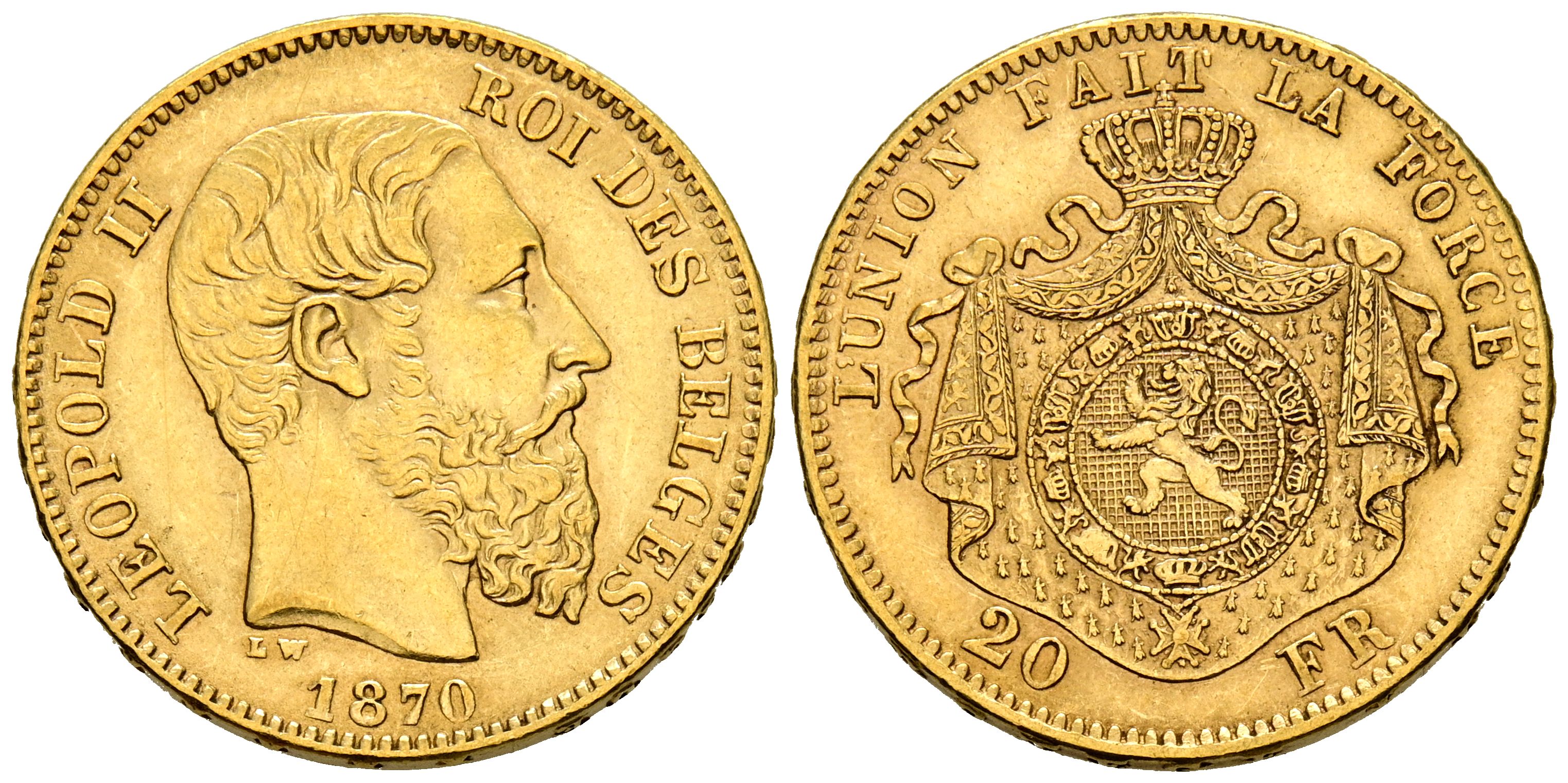 BELGICA, Leopoldo II (1865-1909). 20 Francos. (Au. 6,41g/21mm). 1870. Bruselas. (Km#32). MBC+.