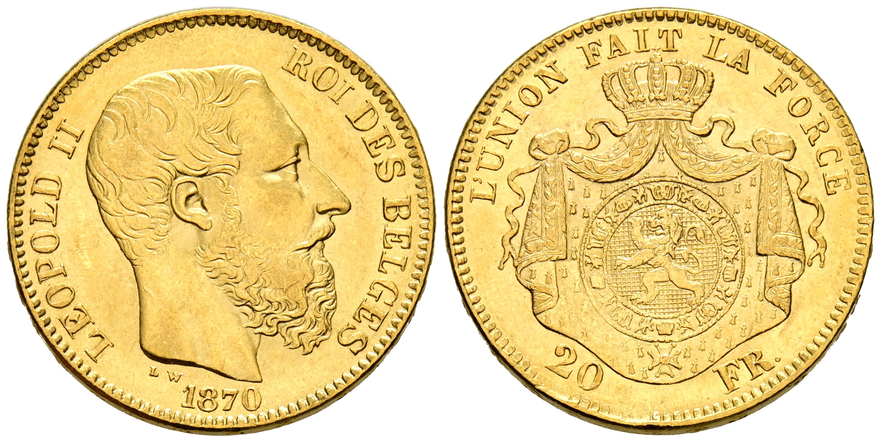 BELGICA, Leopoldo II (1865-1909). 20 Francos. (Au. 6,45g/21mm). 1869. Bruselas. (Km#32). MBC.