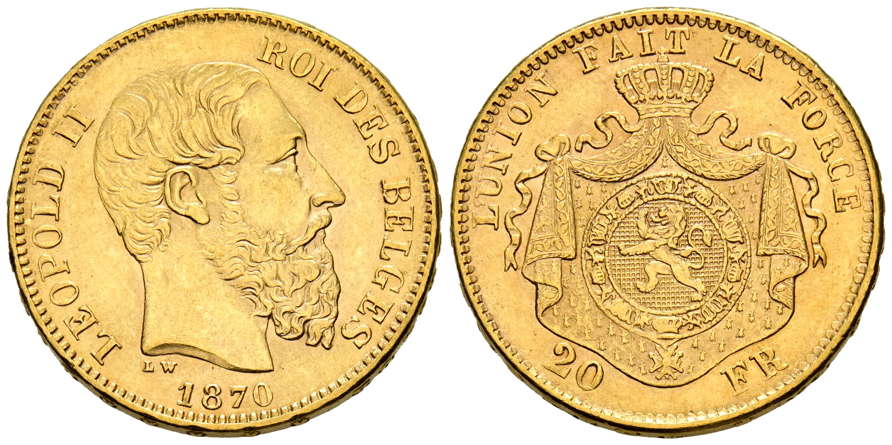 BELGICA, Leopoldo II (1865-1909). 20 Francos. (Au. 6,45g/21mm). 1870. Bruselas. (Km#32). MBC.