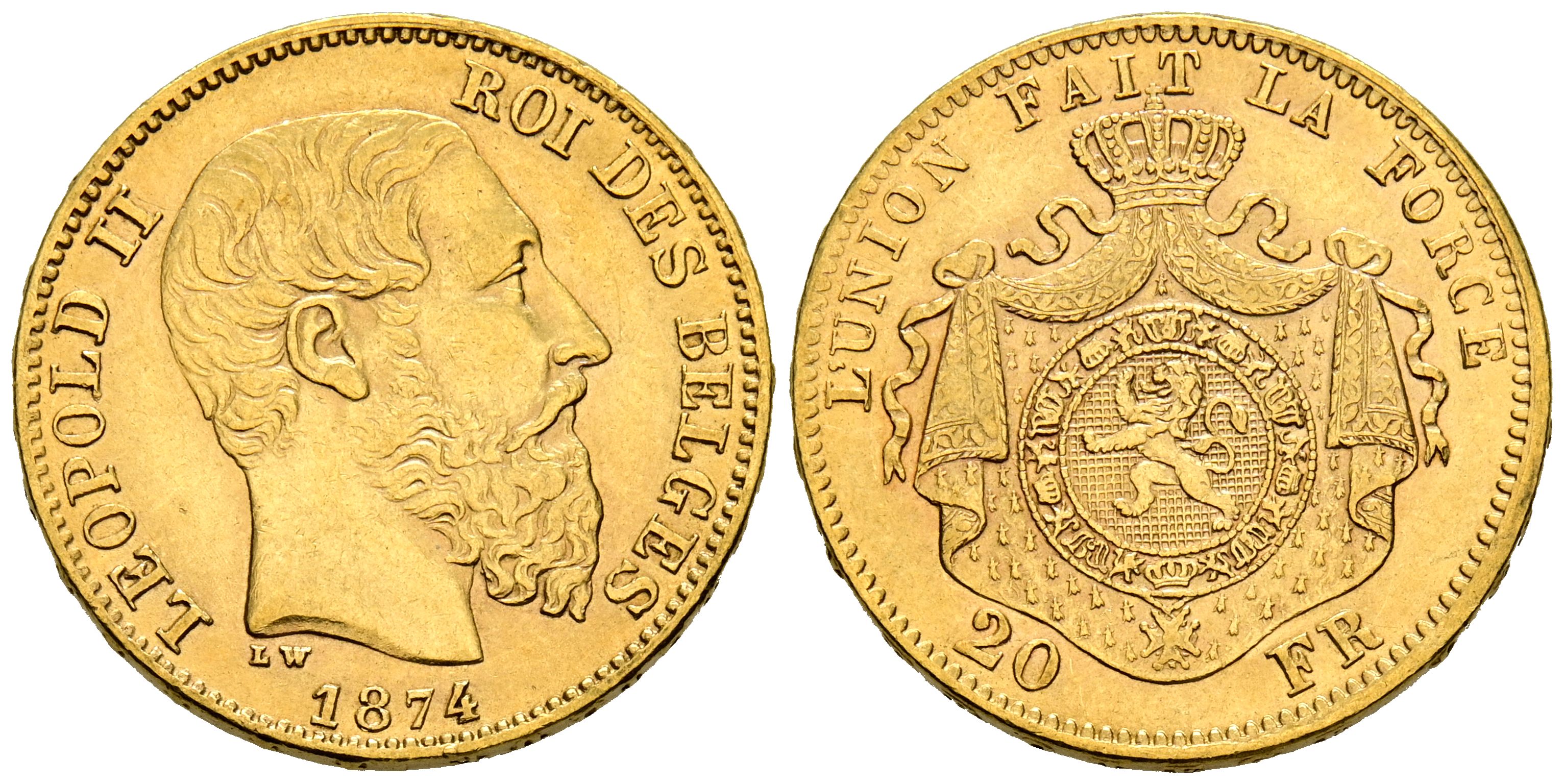 BELGICA, Leopoldo II (1865-1909). 20 Francos. (Au. 6,46g/21mm). 1874. Bruselas. (Km#37). MBC.