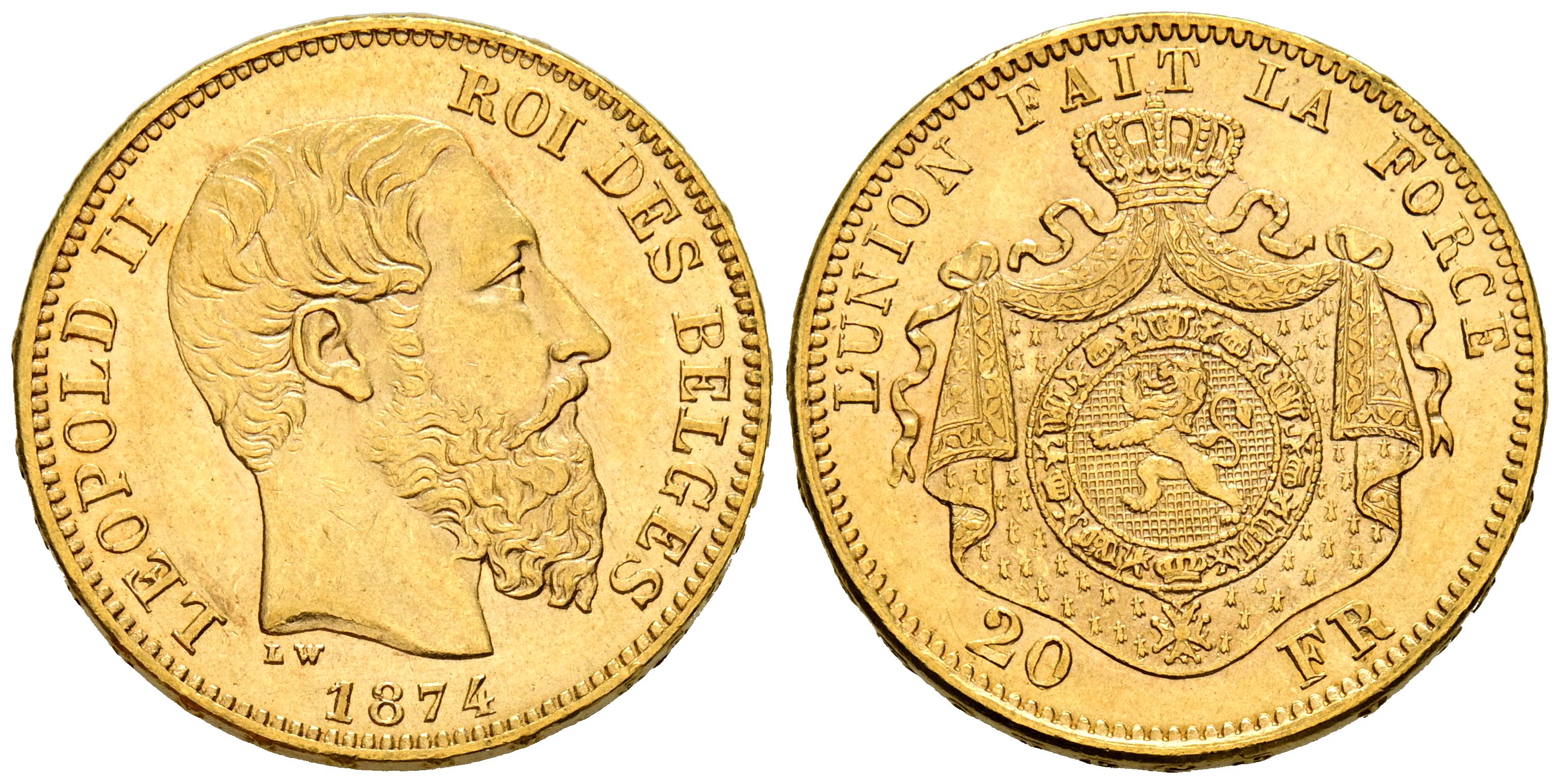 BELGICA, Leopoldo II (1865-1909). 20 Francos. (Au. 6,46g/21mm). 1874. Bruselas. (Km#37). MBC+.