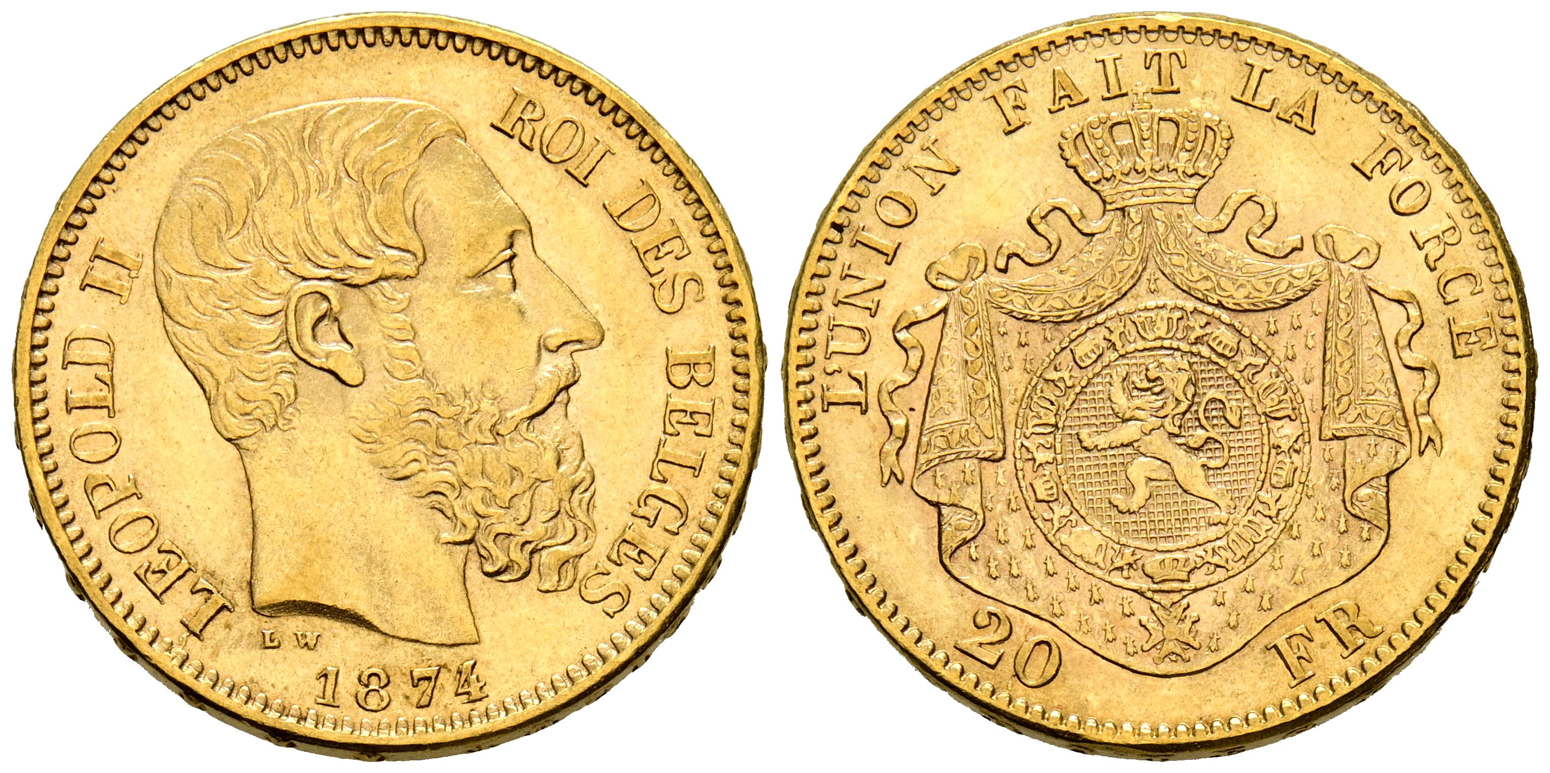 BELGICA, Leopoldo II (1865-1909). 20 Francos. (Au. 6,43g/21mm). 1874. Bruselas. (Km#37). MBC+.