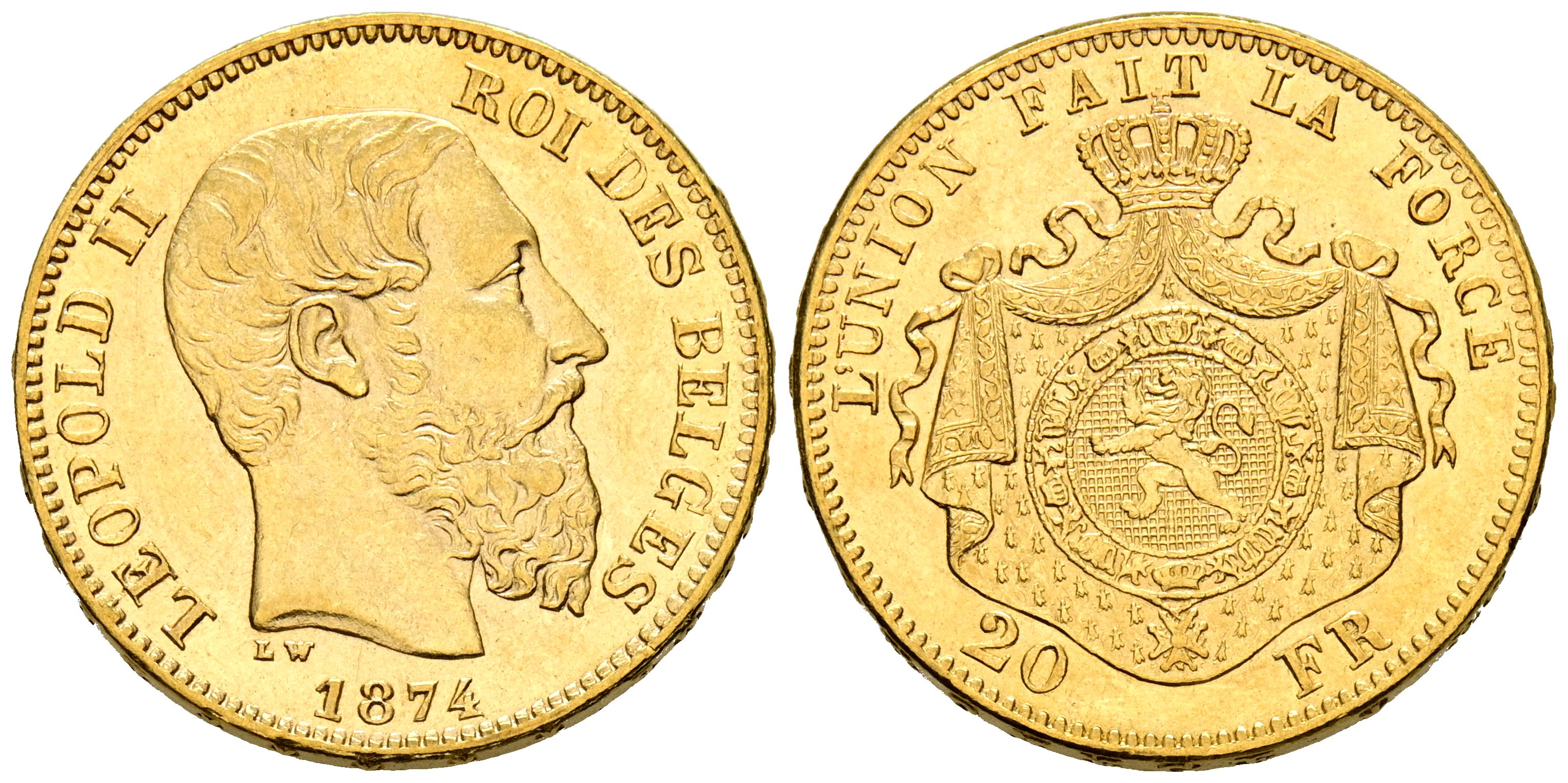 BELGICA, Leopoldo II (1865-1909). 20 Francos. (Au. 6,46g/21mm). 1874. Bruselas. (Km#37). MBC.