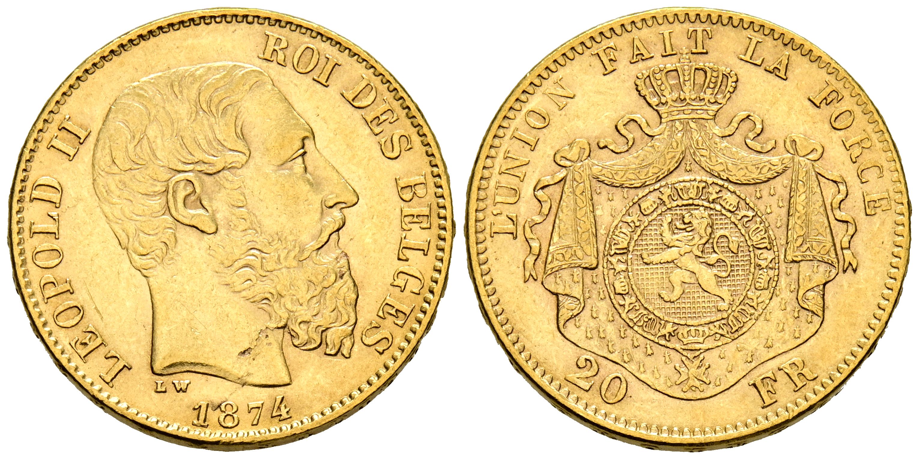 BELGICA, Leopoldo II (1865-1909). 20 Francos. (Au. 6,44g/21mm). 1874. Bruselas. (Km#37). MBC.