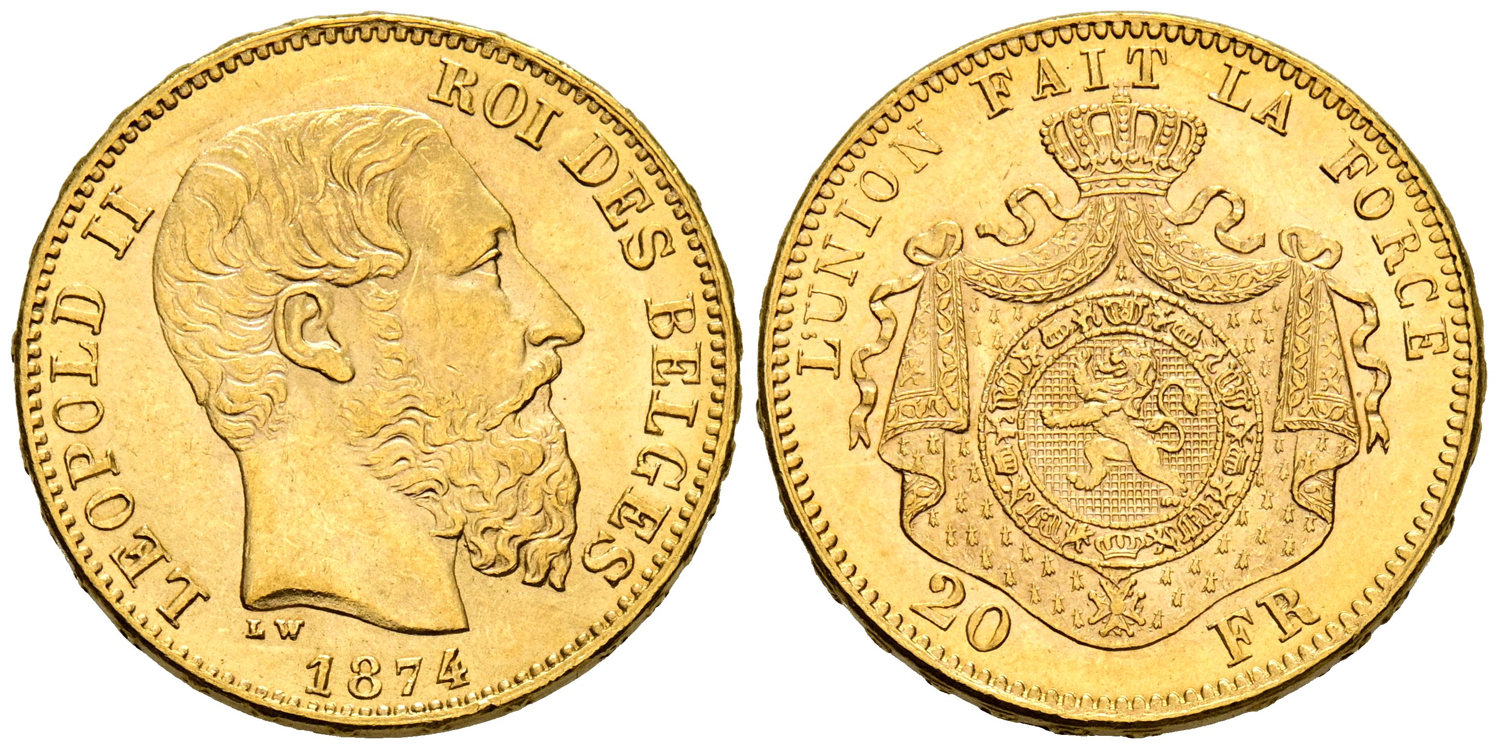 BELGICA, Leopoldo II (1865-1909). 20 Francos. (Au. 6,47g/21mm). 1874. Bruselas. (Km#37). MBC+.