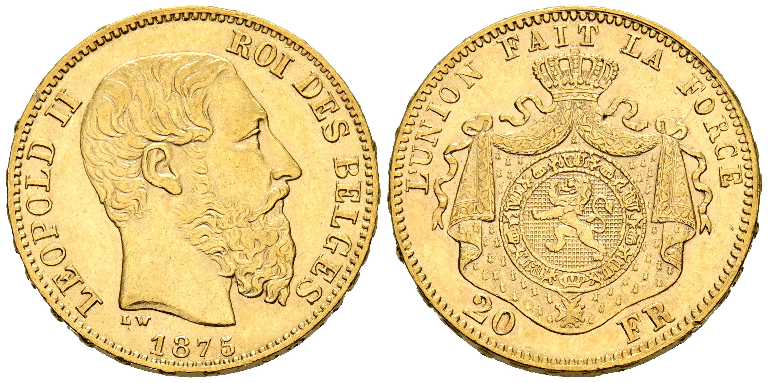 BELGICA, Leopoldo II (1865-1909). 20 Francos. (Au. 6,44g/21mm). 1875. Bruselas. (Km#37). MBC.