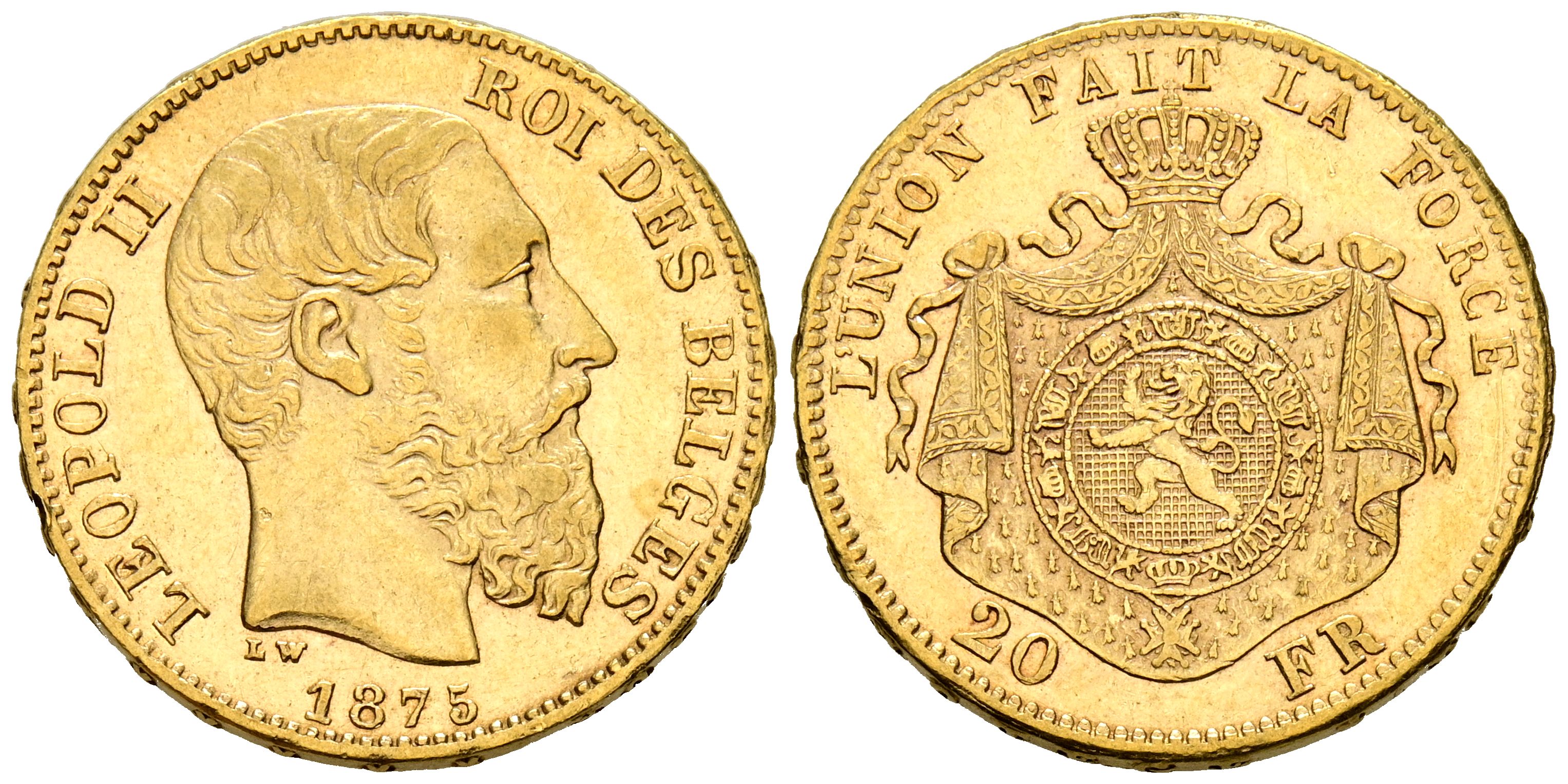 BELGICA, Leopoldo II (1865-1909). 20 Francos. (Au. 6,43g/21mm). 1875. Bruselas. (Km#37). MBC.