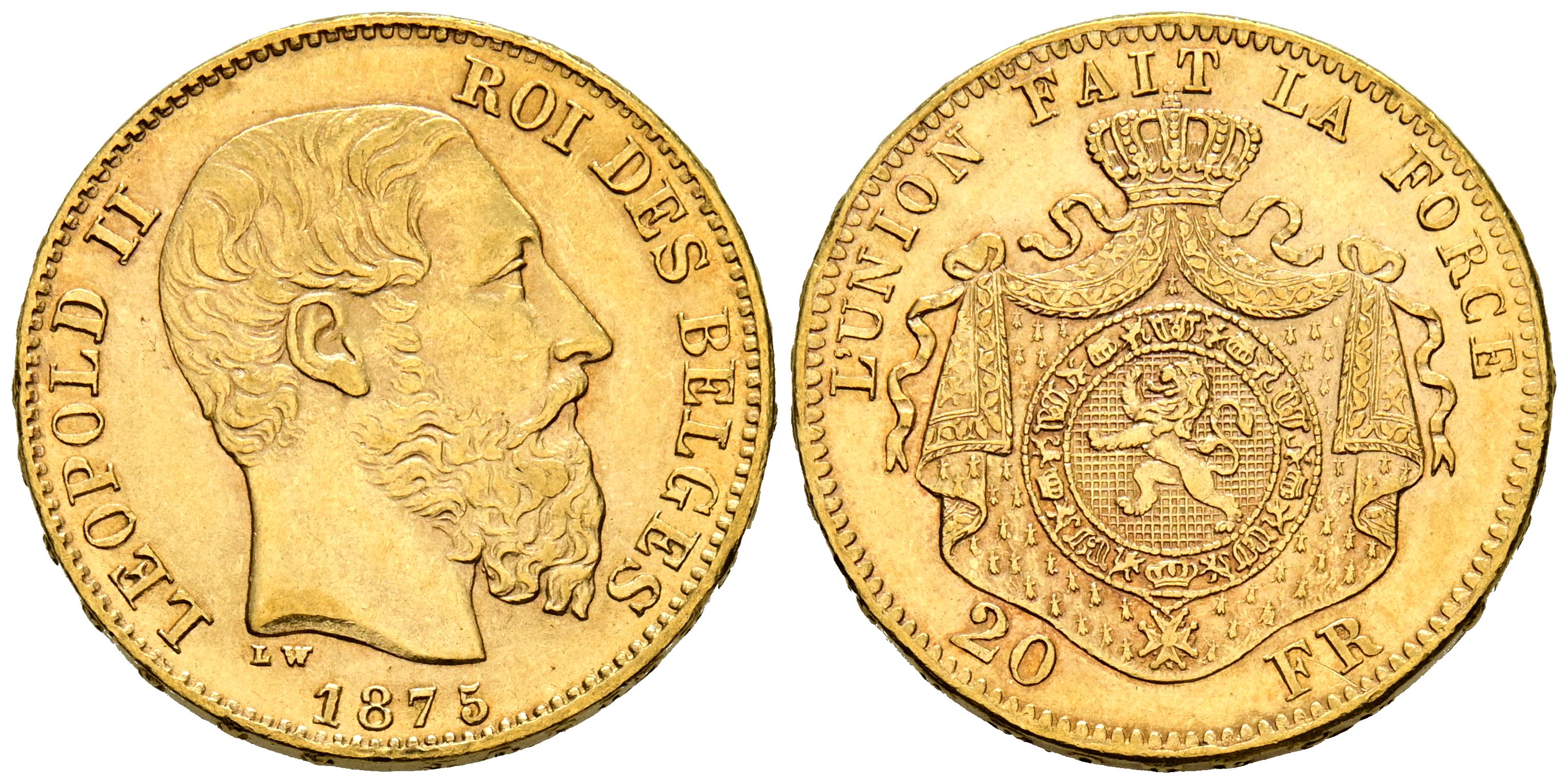 BELGICA, Leopoldo II (1865-1909). 20 Francos. (Au. 6,43g/21mm). 1875. Bruselas. (Km#37). MBC.