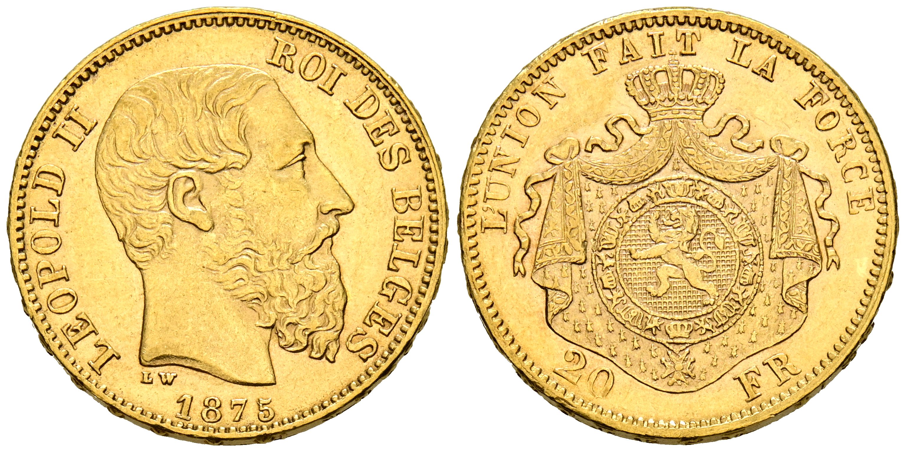 BELGICA, Leopoldo II (1865-1909). 20 Francos. (Au. 6,44g/21mm). 1875. Bruselas. (Km#37). MBC+.