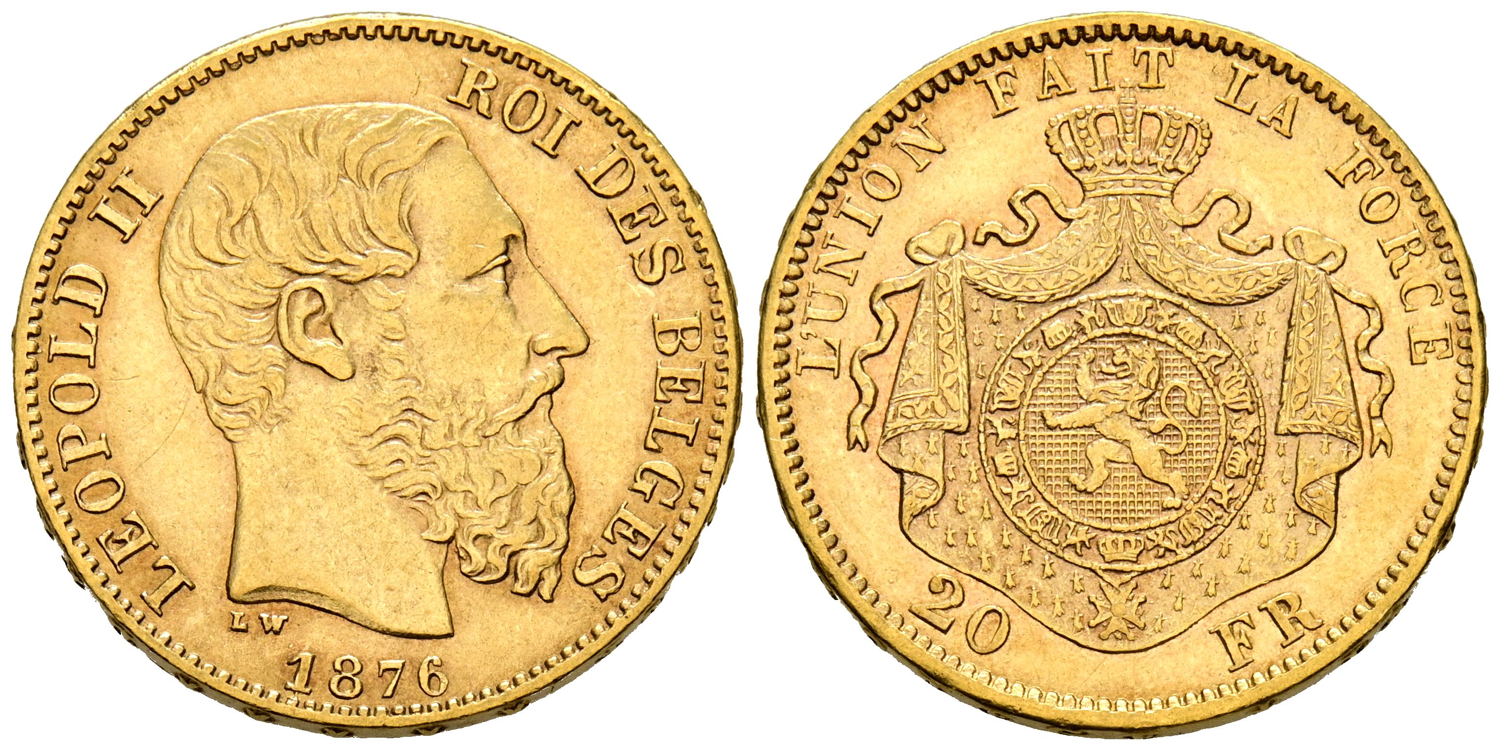 BELGICA, Leopoldo II (1865-1909). 20 Francos. (Au. 6,43g/21mm). 1876. Bruselas. (Km#37). MBC.