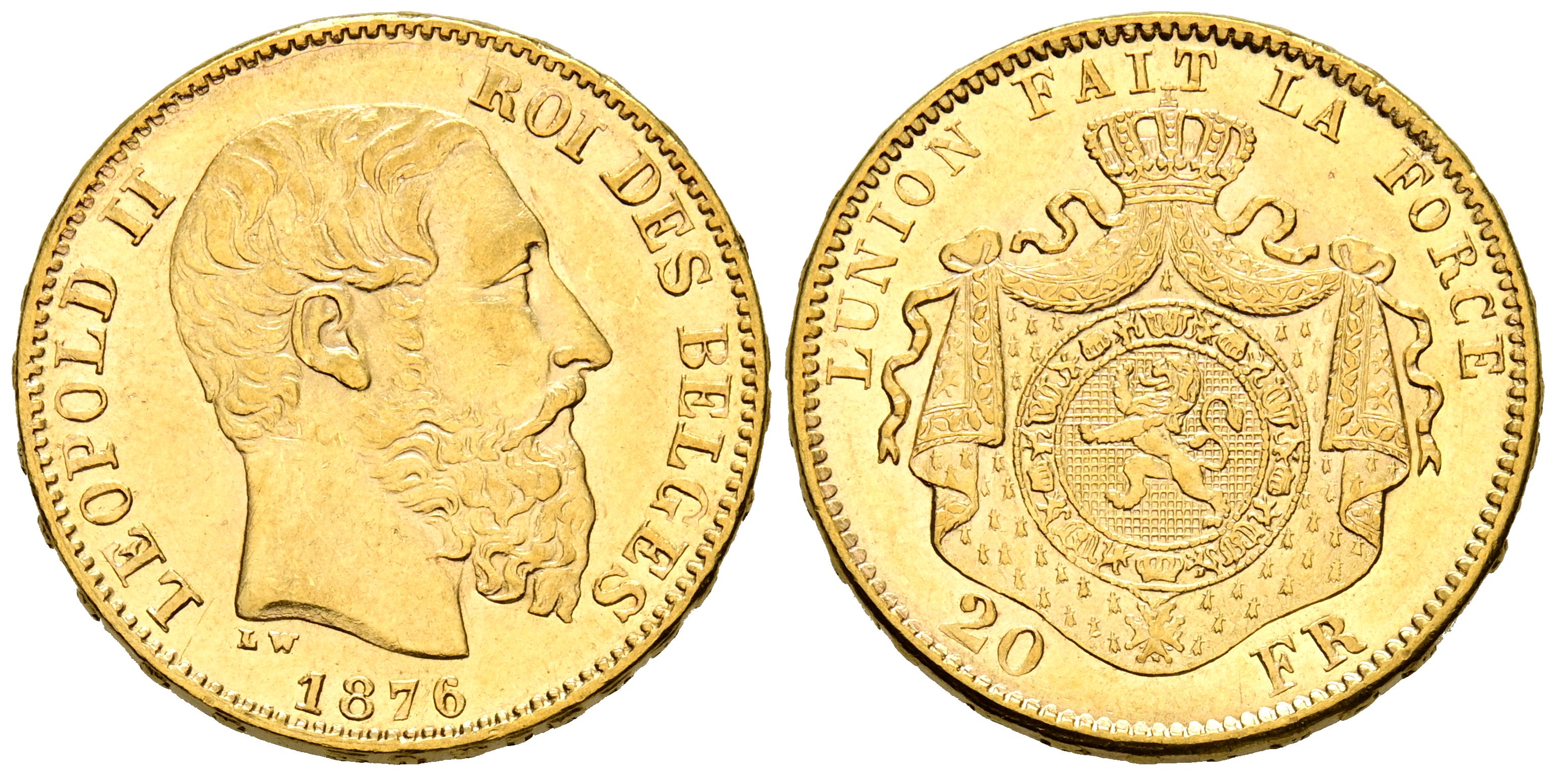 BELGICA, Leopoldo II (1865-1909). 20 Francos. (Au. 6,44g/21mm). 1876. Bruselas. (Km#37). MBC.