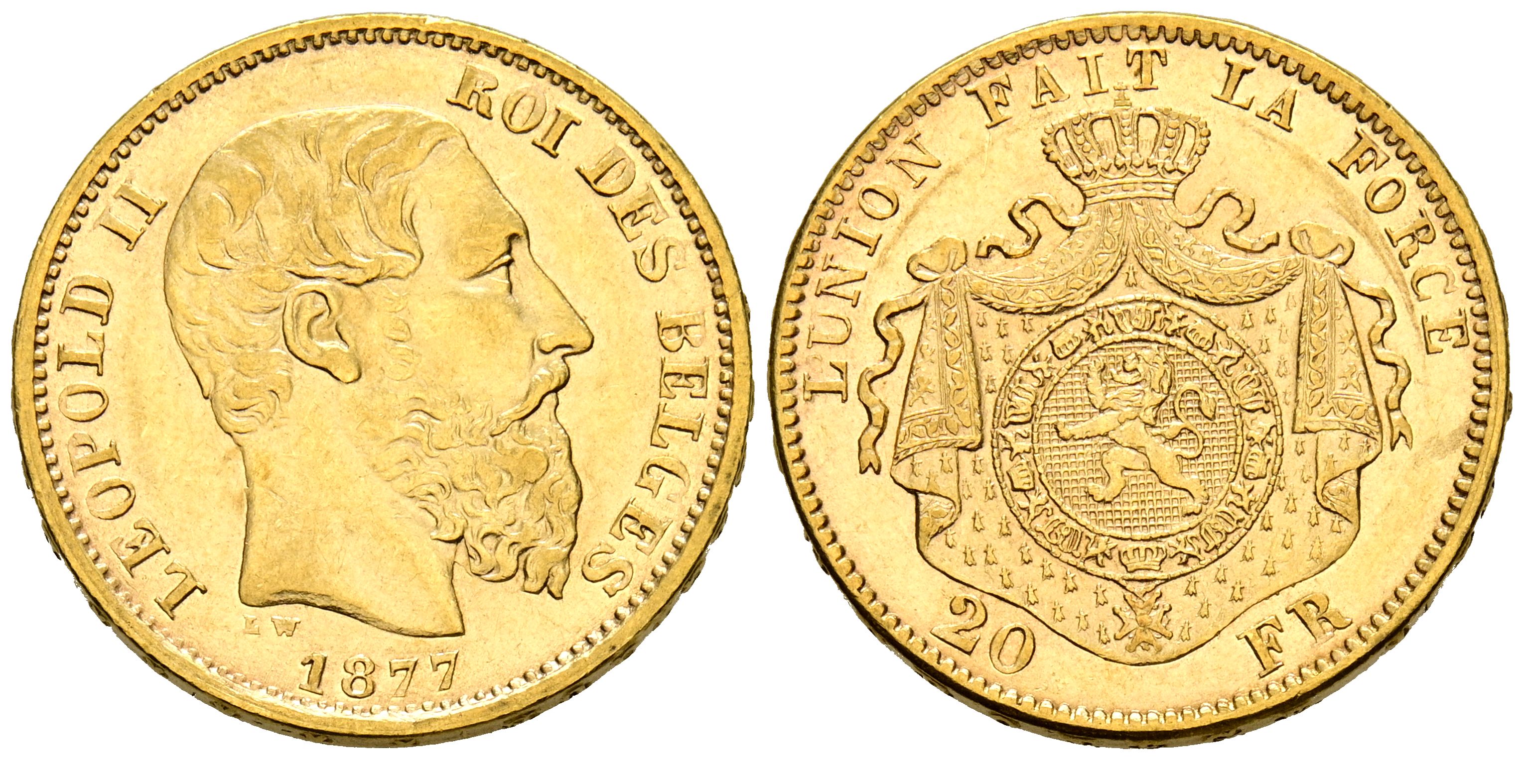 BELGICA, Leopoldo II (1865-1909). 20 Francos. (Au. 6,43g/21mm). 1877. Bruselas. (Km#37). MBC.