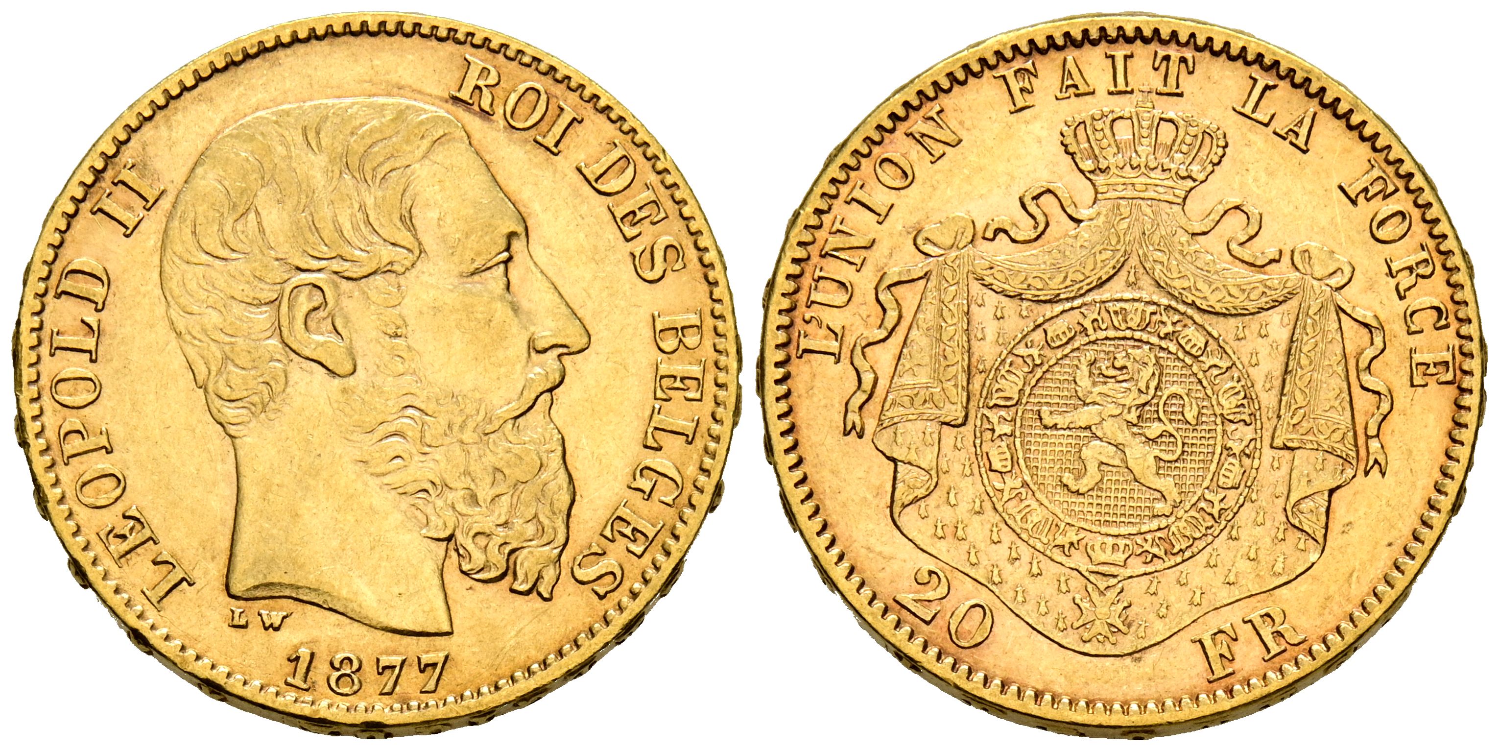BELGICA, Leopoldo II (1865-1909). 20 Francos. (Au. 6,43g/21mm). 1877. Bruselas. (Km#37). MBC.