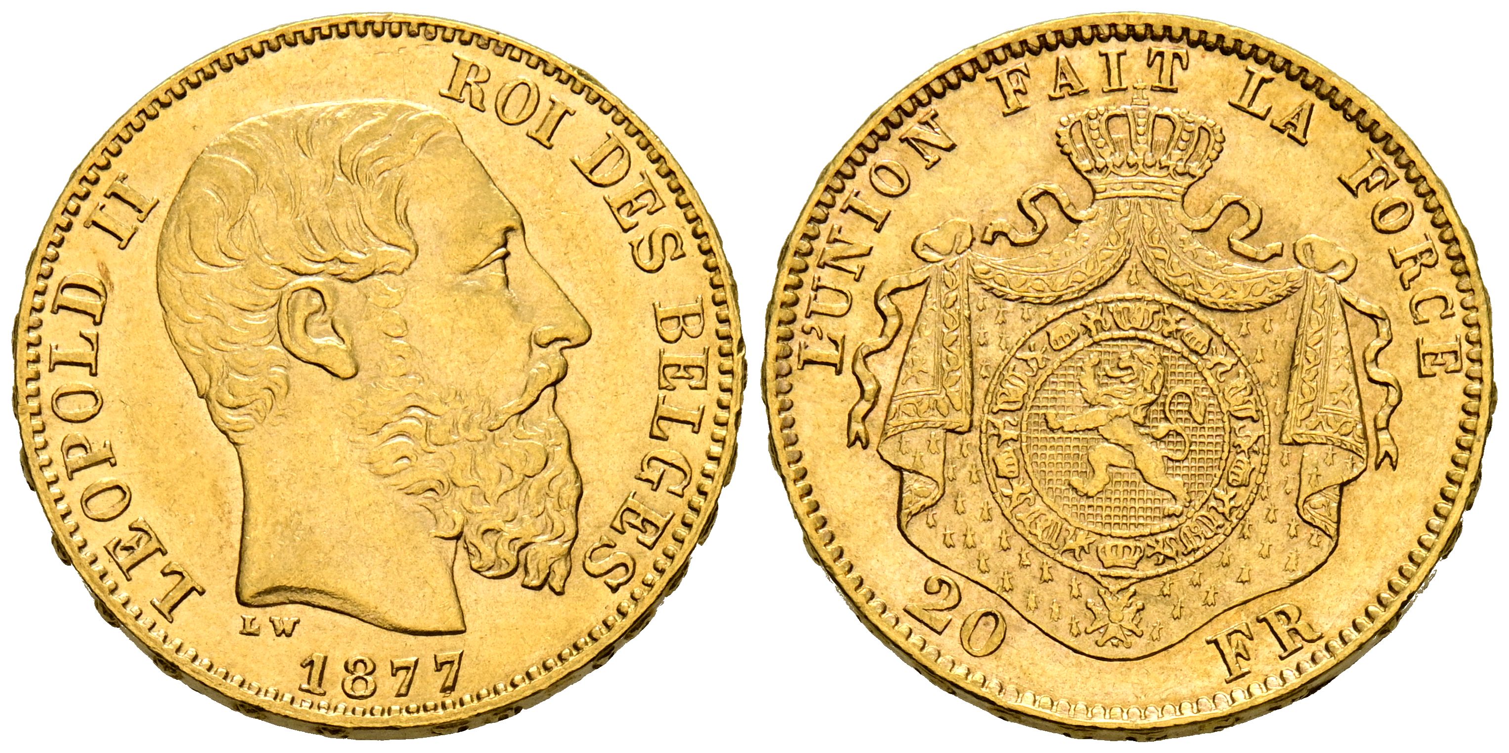 BELGICA, Leopoldo II (1865-1909). 20 Francos. (Au. 6,46g/21mm). 1877. Bruselas. (Km#37). MBC+.