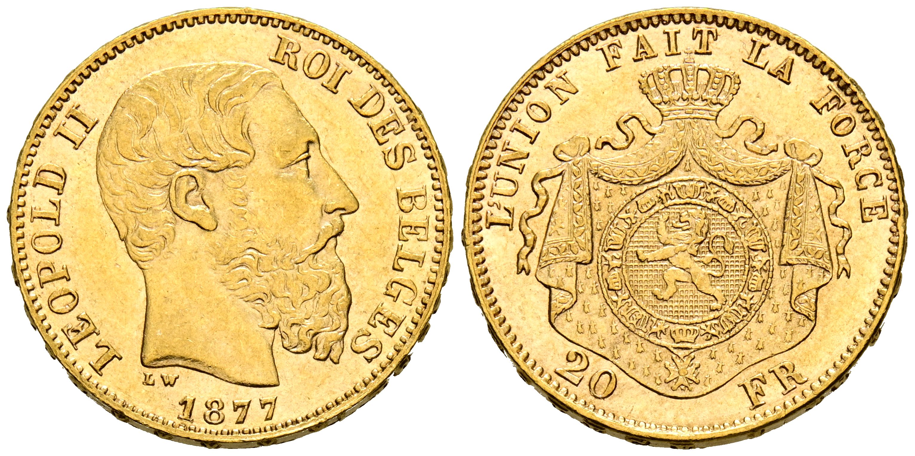 BELGICA, Leopoldo II (1865-1909). 20 Francos. (Au. 6,45g/21mm). 1877. Bruselas. (Km#37). MBC+.