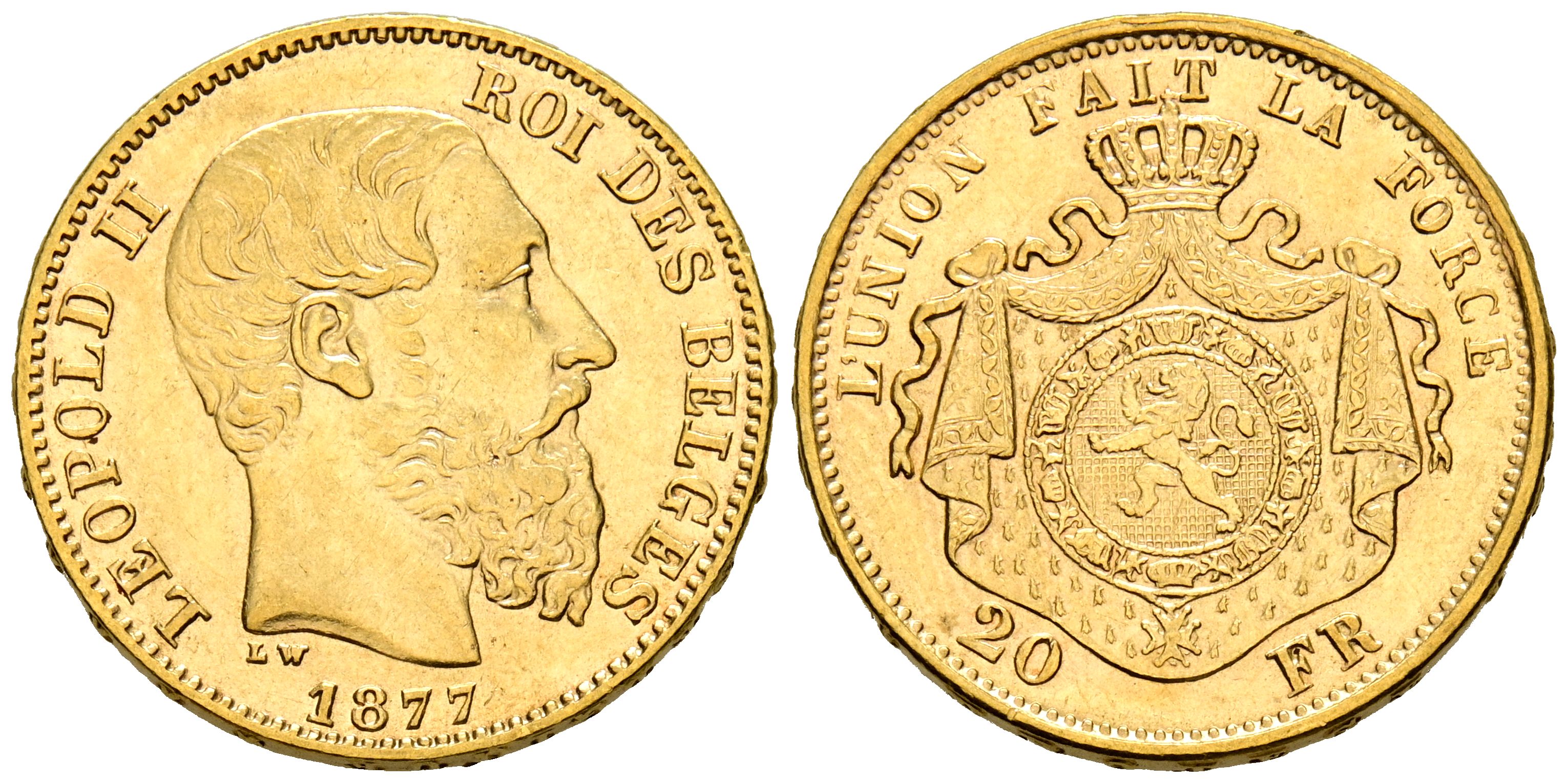 BELGICA, Leopoldo II (1865-1909). 20 Francos. (Au. 6,46g/21mm). 1877. Bruselas. (Km#37). MBC.