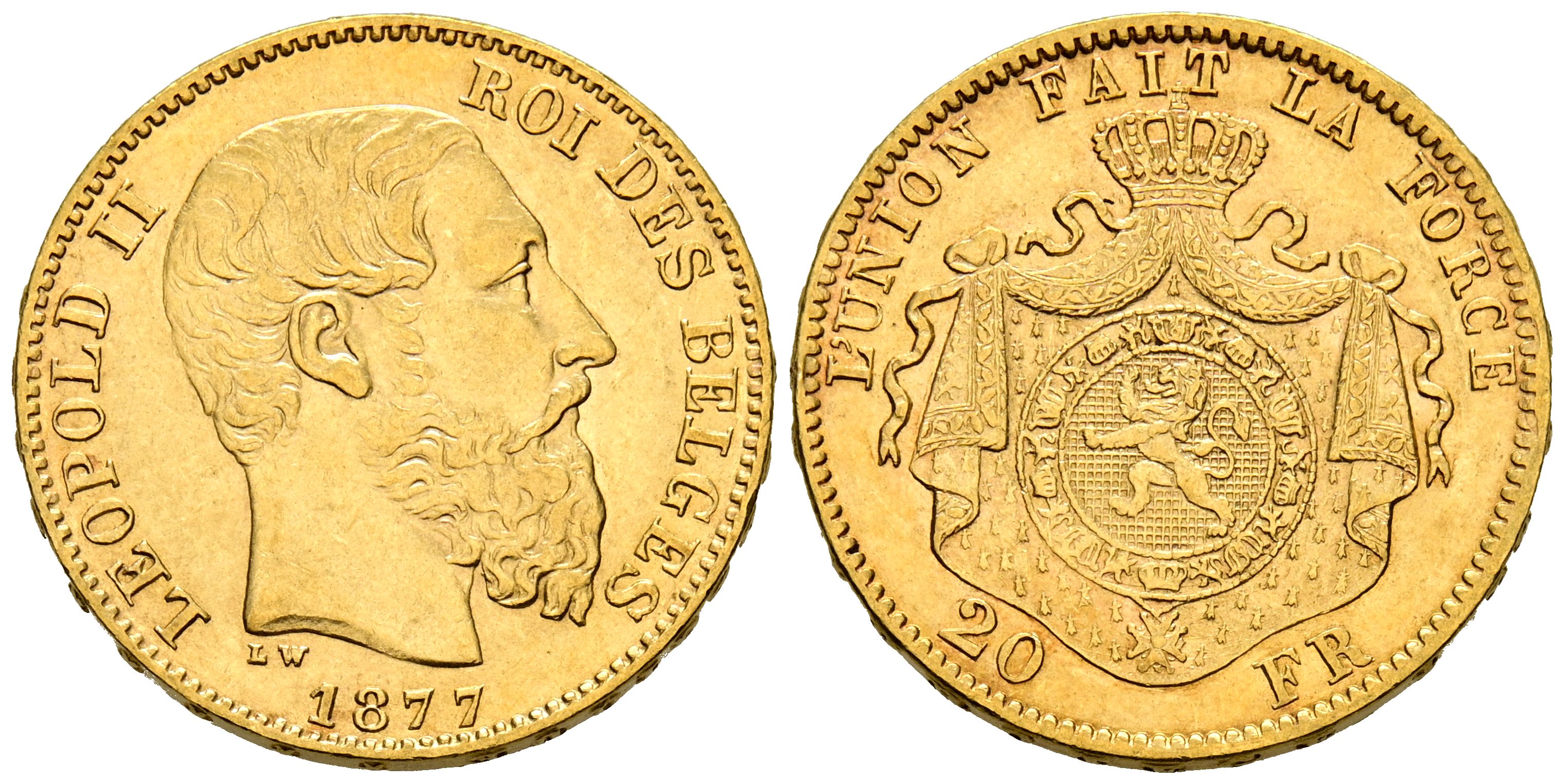 BELGICA, Leopoldo II (1865-1909). 20 Francos. (Au. 6,43g/21mm). 1877. Bruselas. (Km#37). MBC.