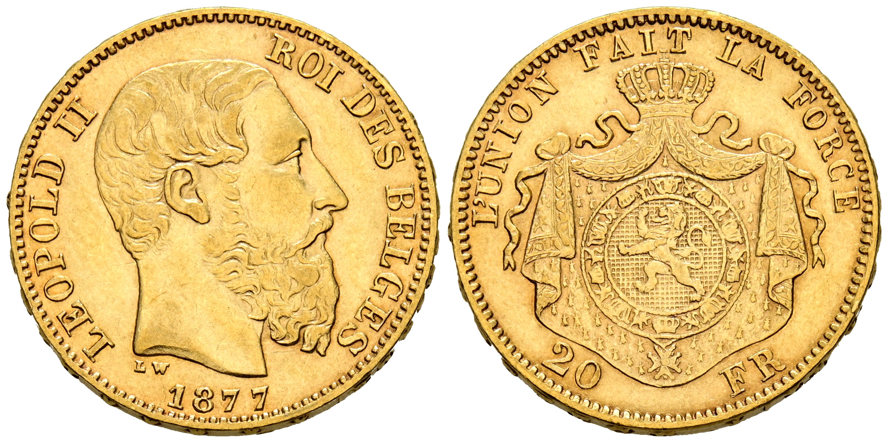 BELGICA, Leopoldo II (1865-1909). 20 Francos. (Au. 6,45g/21mm). 1877. Bruselas. (Km#37). MBC.