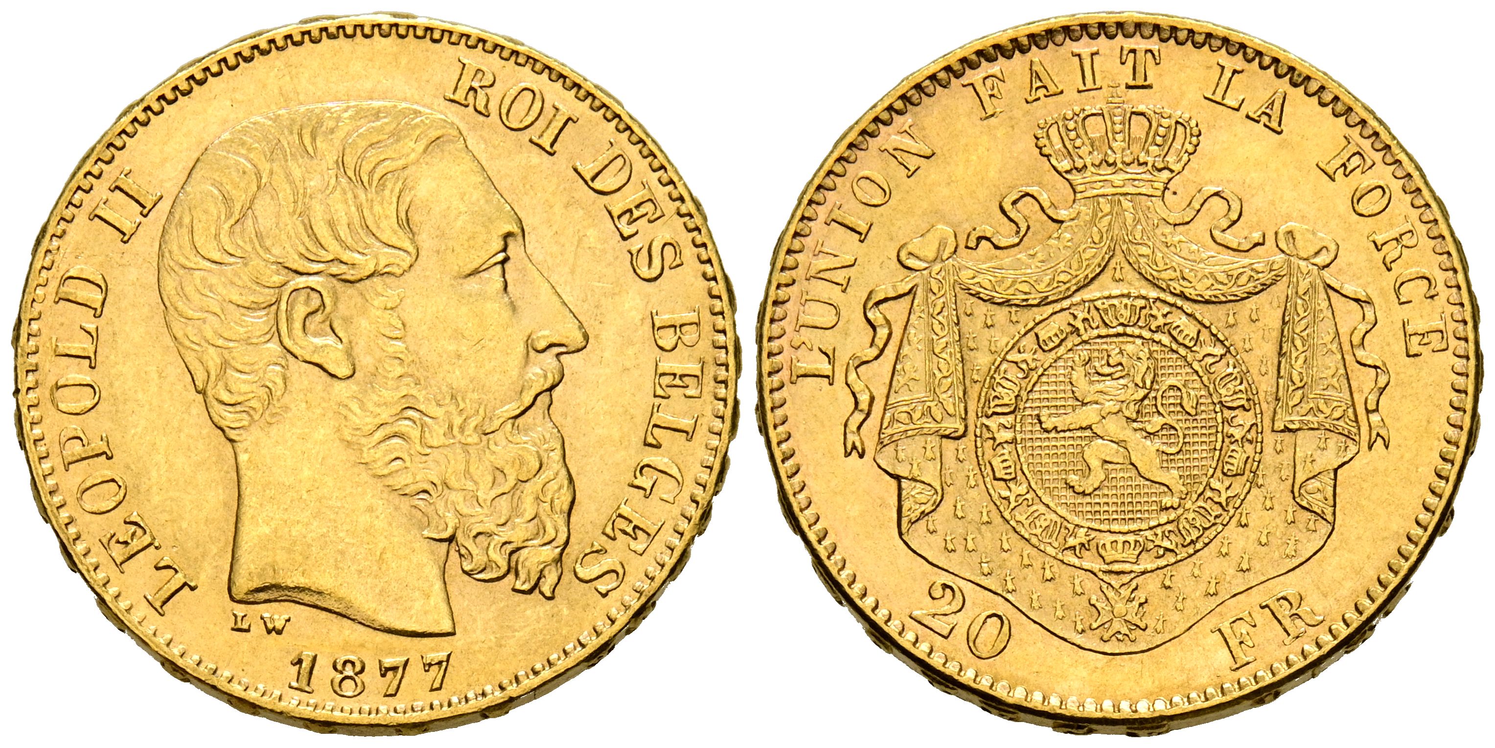 BELGICA, Leopoldo II (1865-1909). 20 Francos. (Au. 6,45g/21mm). 1877. Bruselas. (Km#37). MBC.
