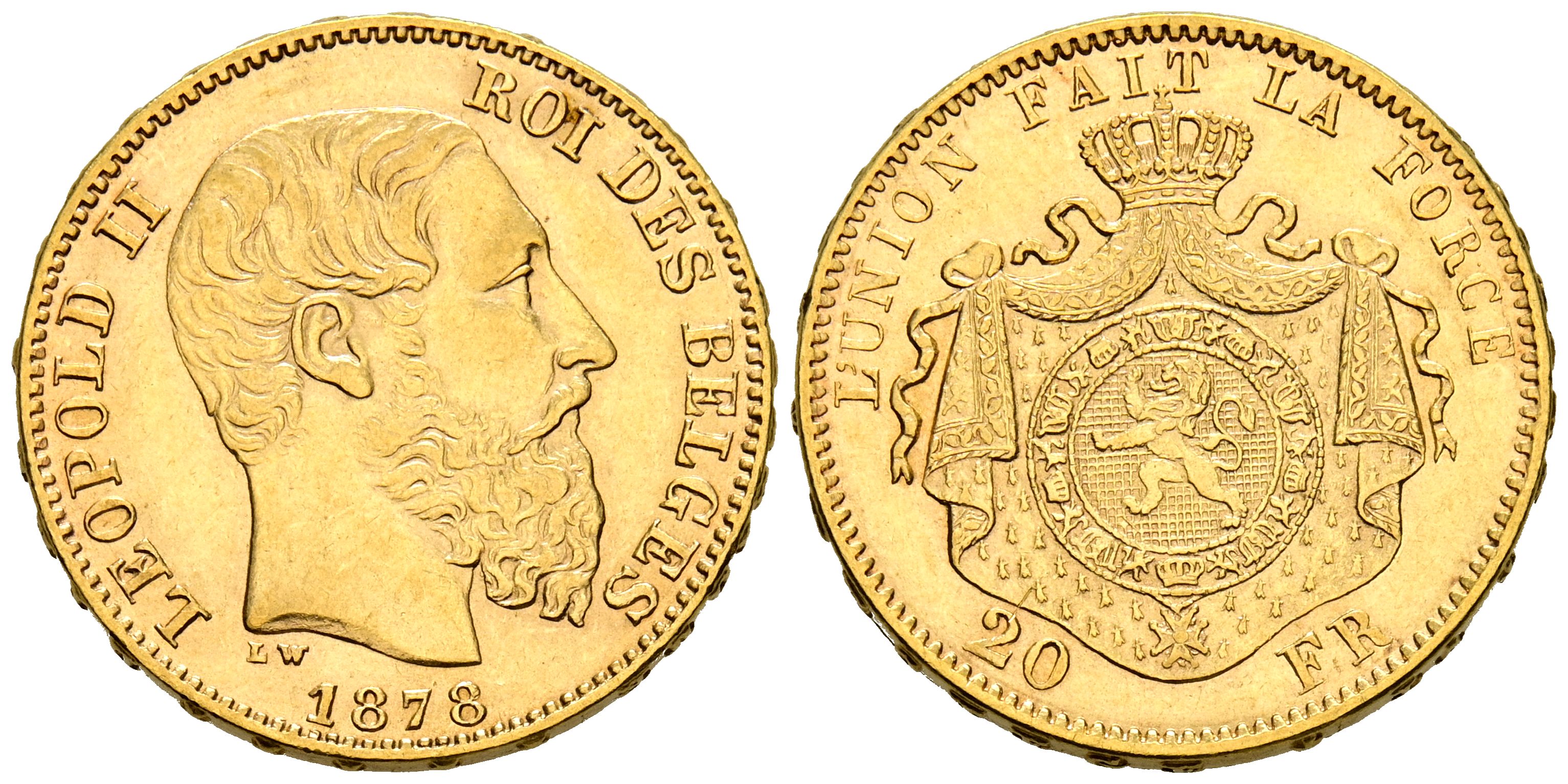 BELGICA, Leopoldo II (1865-1909). 20 Francos. (Au. 6,45g/21mm). 1878. Bruselas. (Km#37). MBC+.