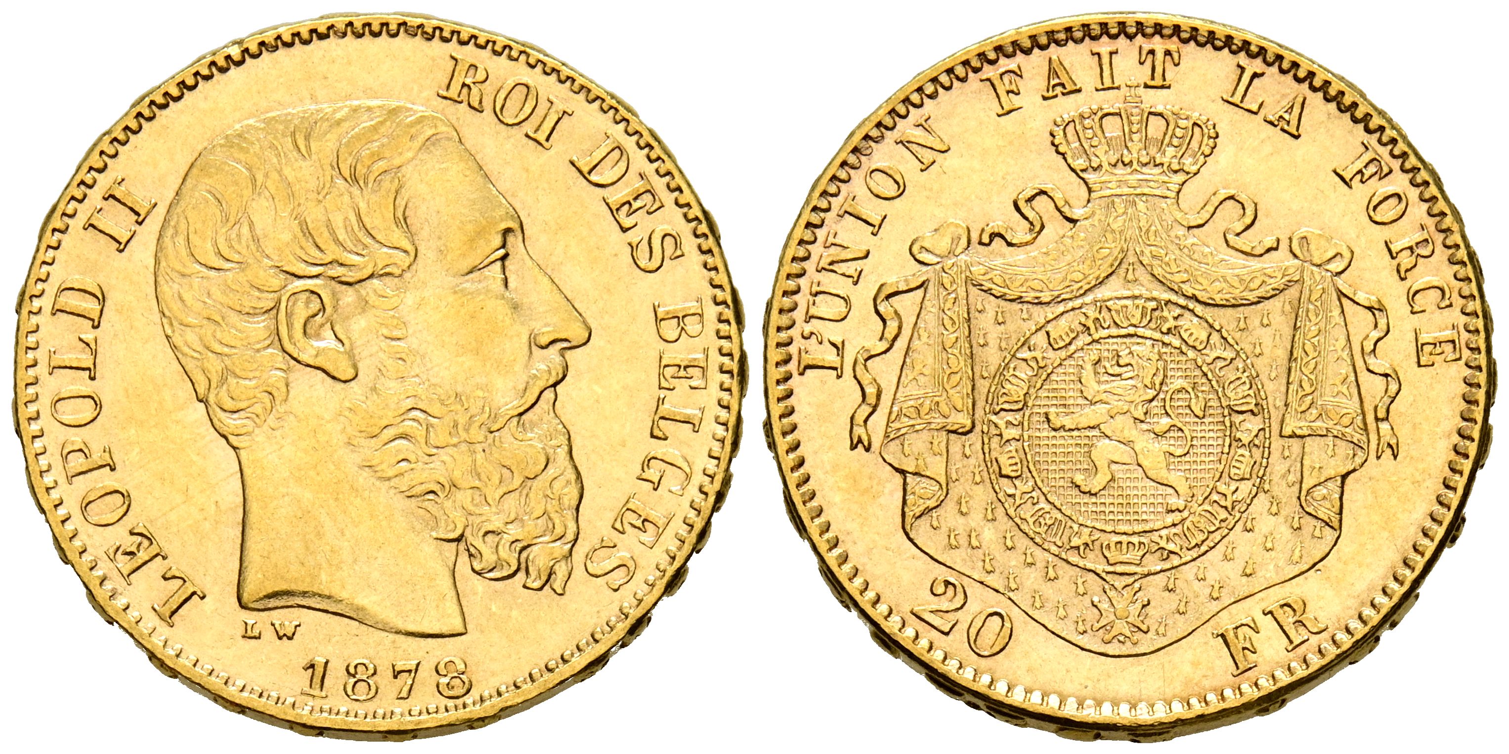 BELGICA, Leopoldo II (1865-1909). 20 Francos. (Au. 6,46g/21mm). 1878. Bruselas. (Km#37). MBC+.
