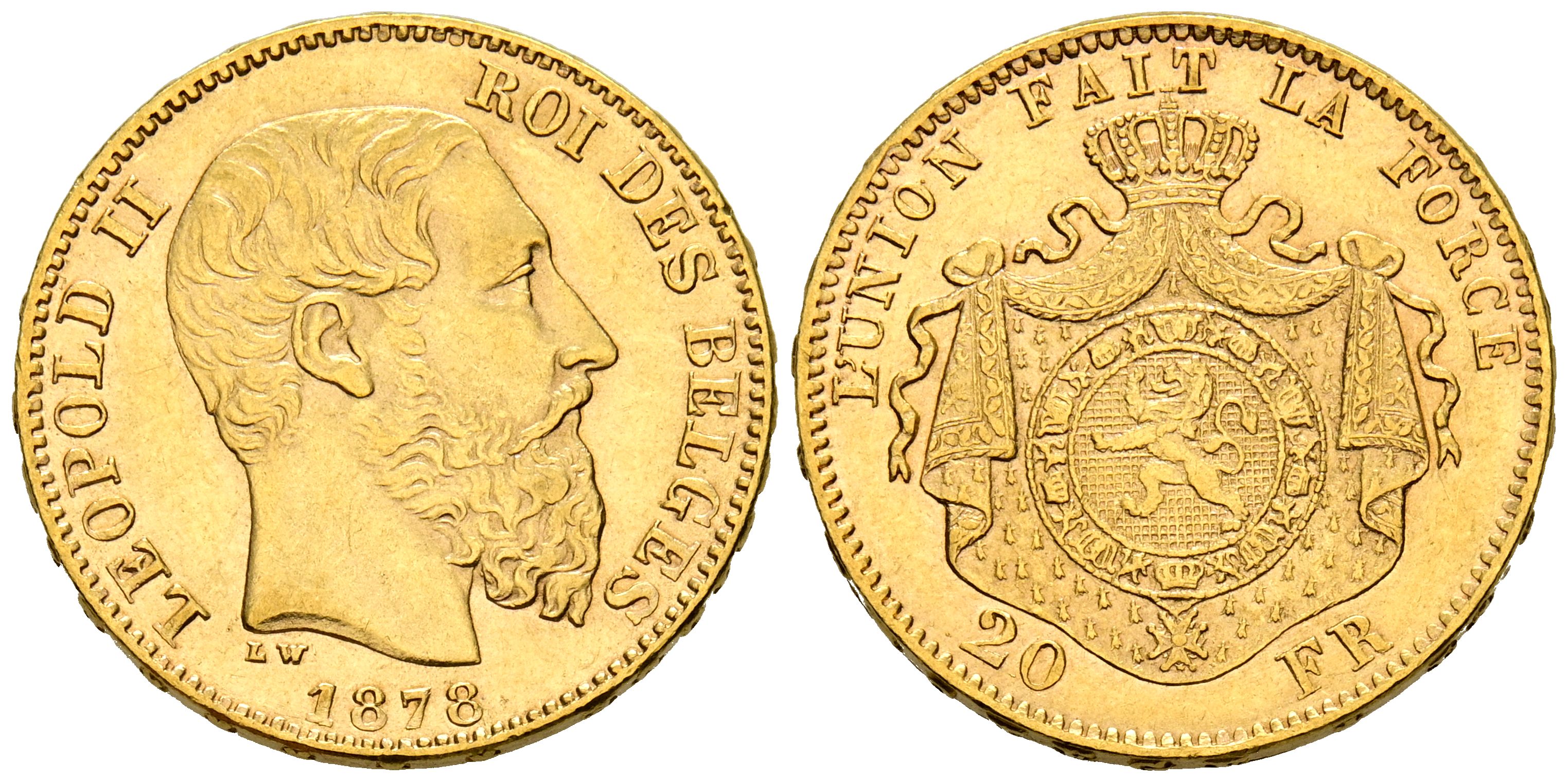 BELGICA, Leopoldo II (1865-1909). 20 Francos. (Au. 6,44g/21mm). 1878. Bruselas. (Km#37). MBC.