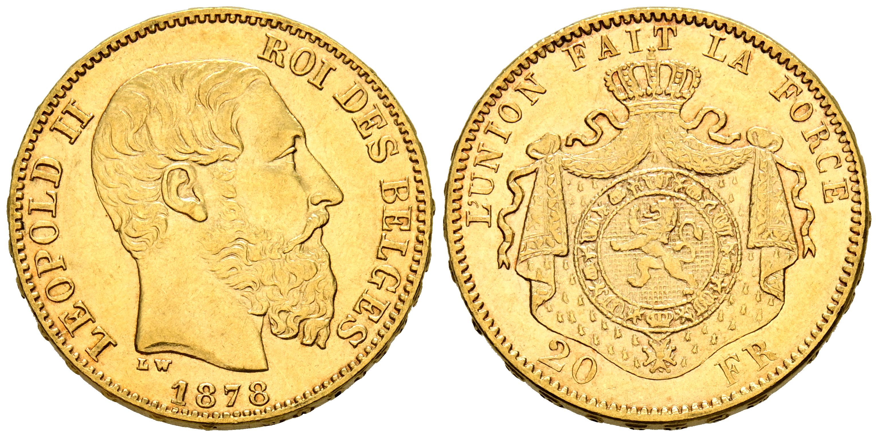 BELGICA, Leopoldo II (1865-1909). 20 Francos. (Au. 6,43g/21mm). 1878. Bruselas. (Km#37). MBC.