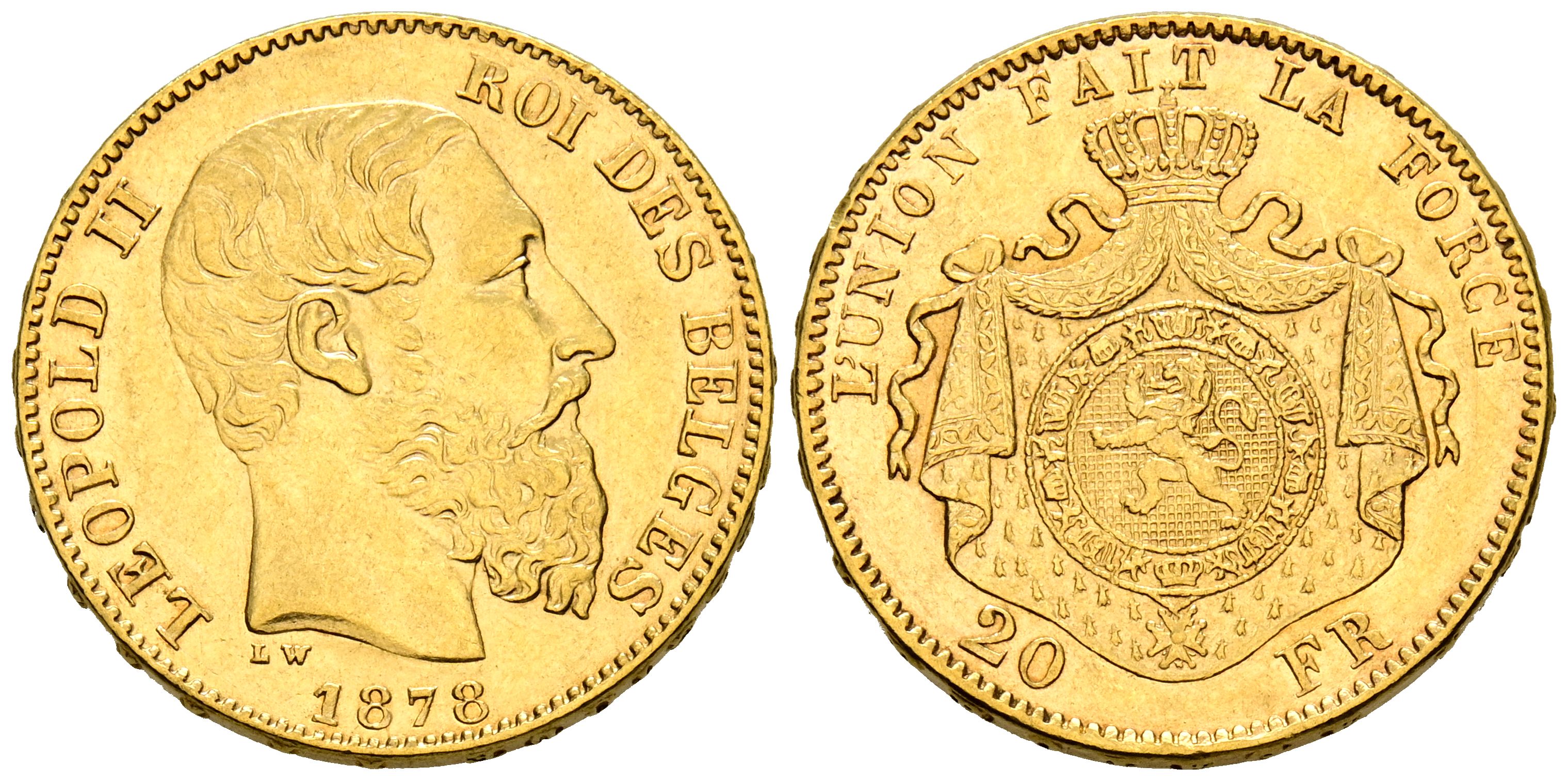 BELGICA, Leopoldo II (1865-1909). 20 Francos. (Au. 6,44g/21mm). 1878. Bruselas. (Km#37). MBC+.