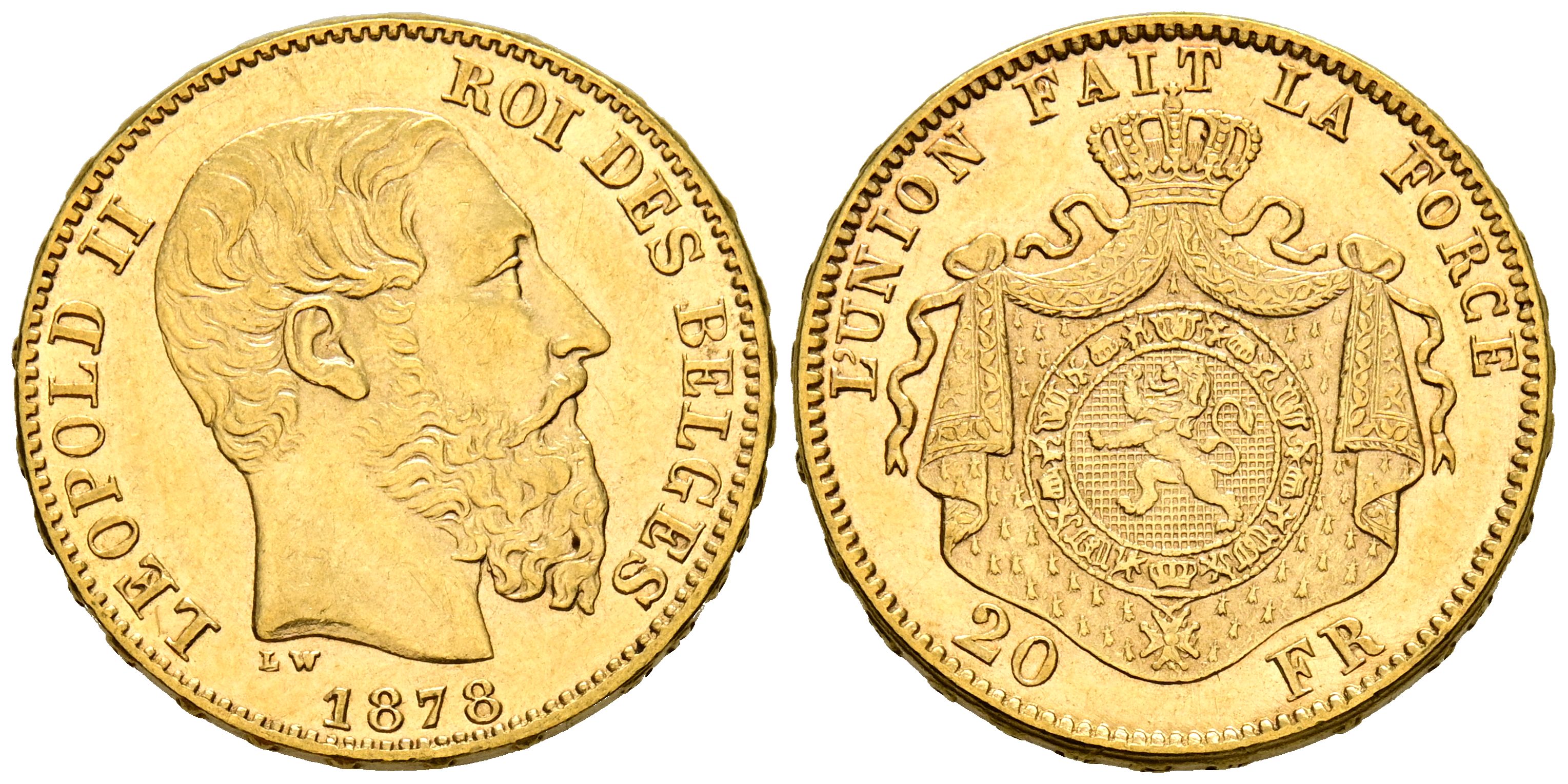 BELGICA, Leopoldo II (1865-1909). 20 Francos. (Au. 6,43g/21mm). 1878. Bruselas. (Km#37). MBC+.