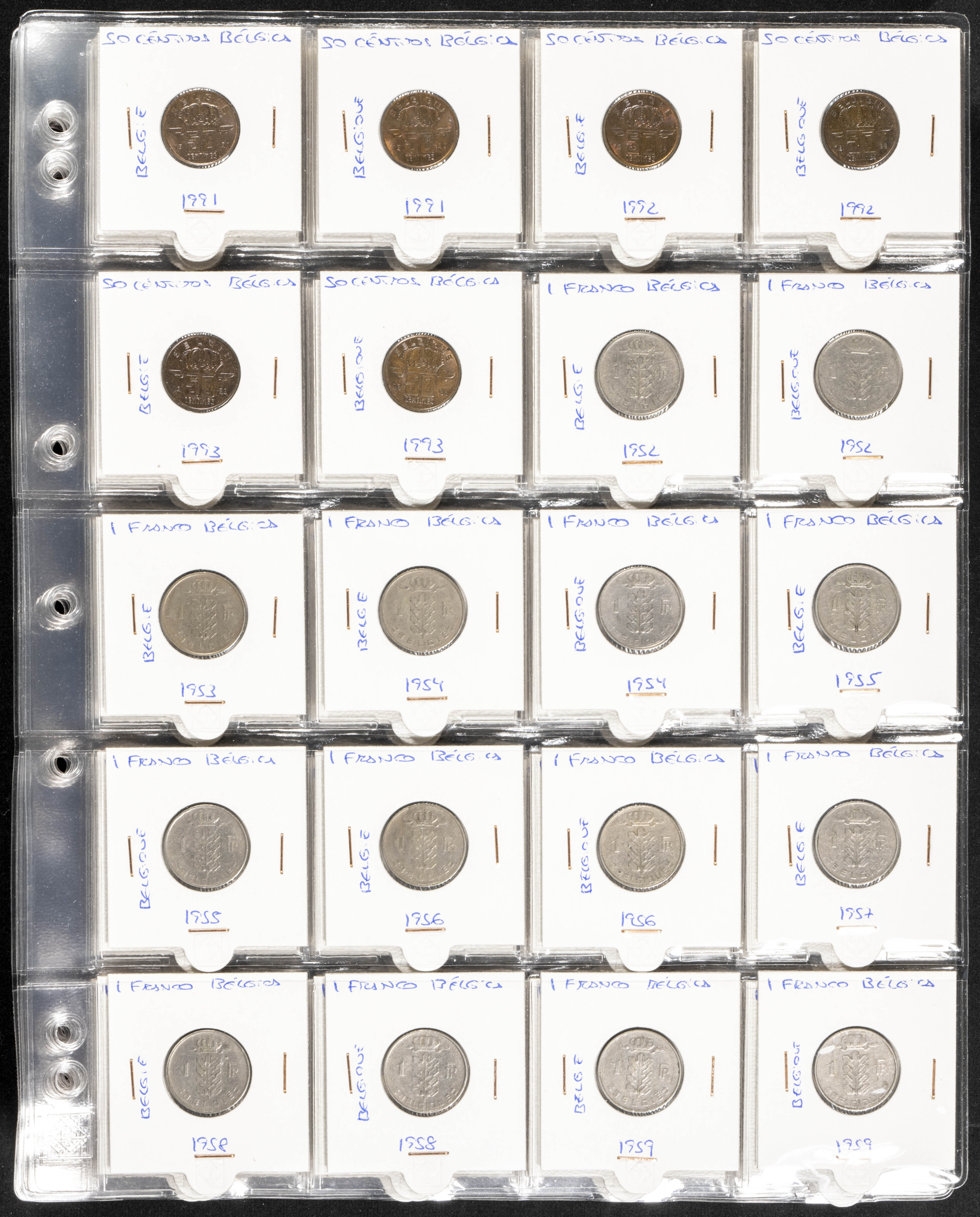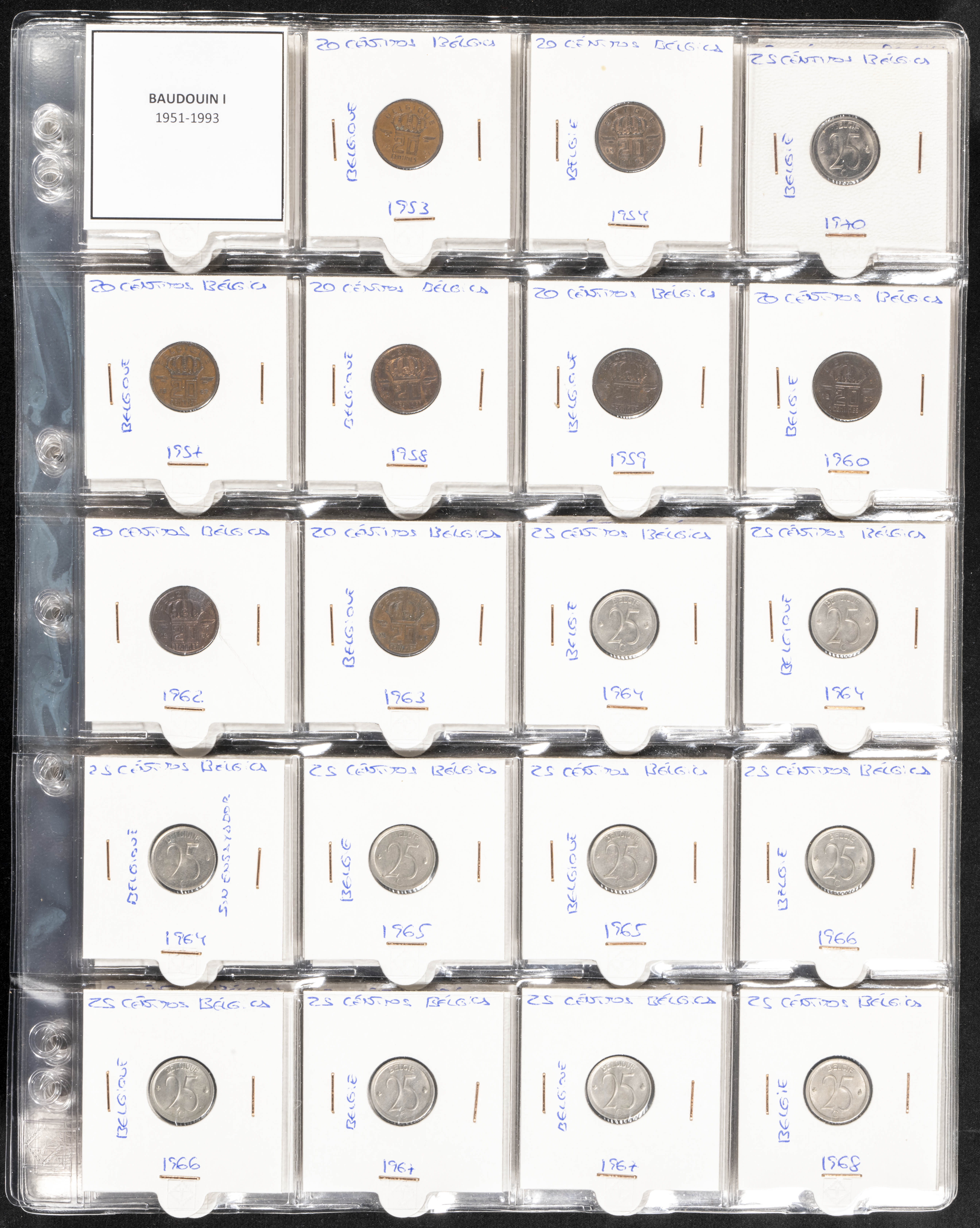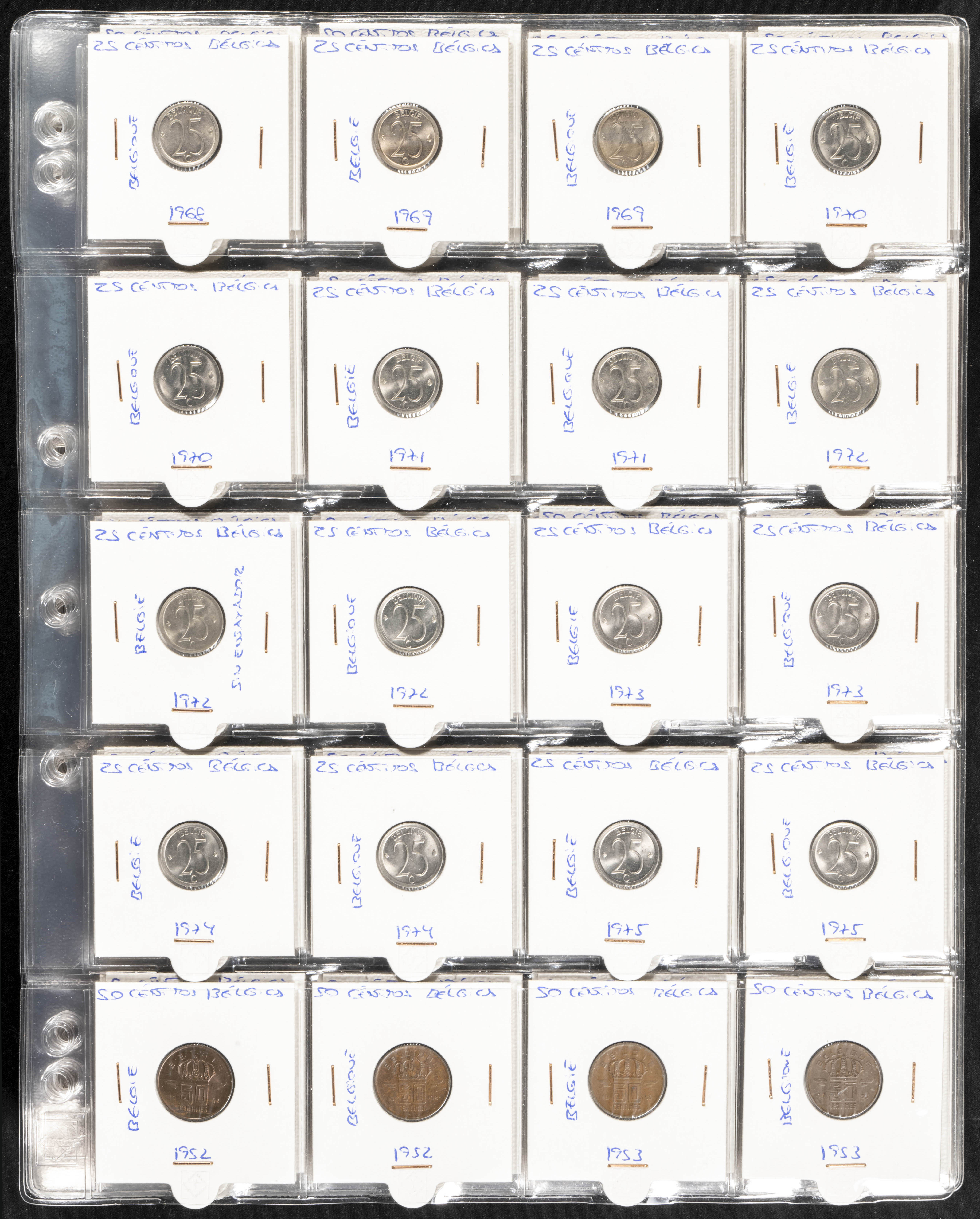 BÉLGICA. Amplia e interesante colección de alrededor de más de 400 monedas expuestas en un álbum y varios sets oficiales, con una gran variedad de módulos, fechas y materiales representados entre los que encontramos interesantes ejemplares en plata y algunas conmemorativas. La colección se desarrolla en el periodo comprendido entre 1953 y 2001 (Reinados de Balduino I y Alberto II), sin piezas repetidas y con leyendas en las mismas en francés y flamenco y comprende todas las monedas circulantes de esos años (incluídos sets de monedas y plata circulante). Alto nivel de conservación general. A EXAMINAR.