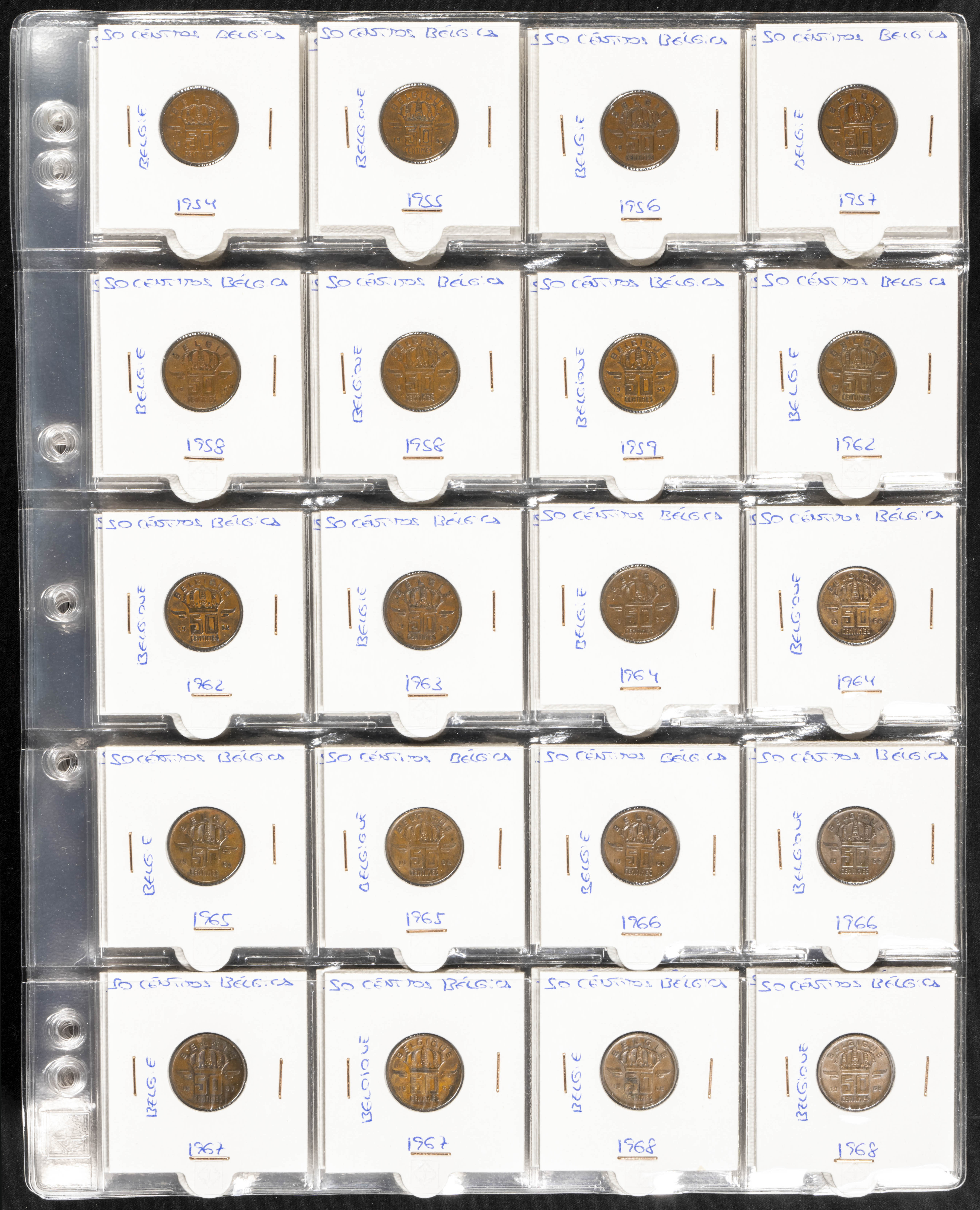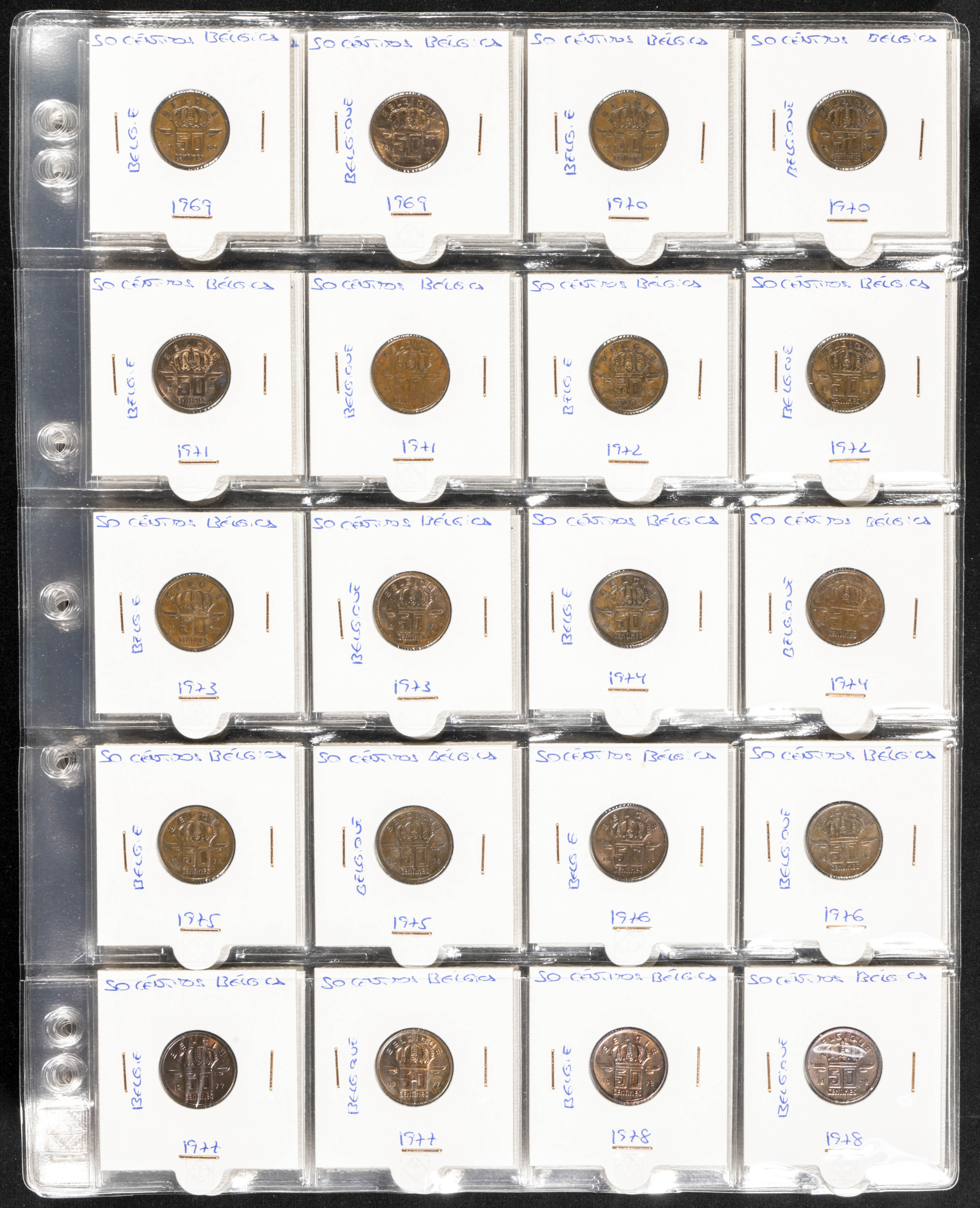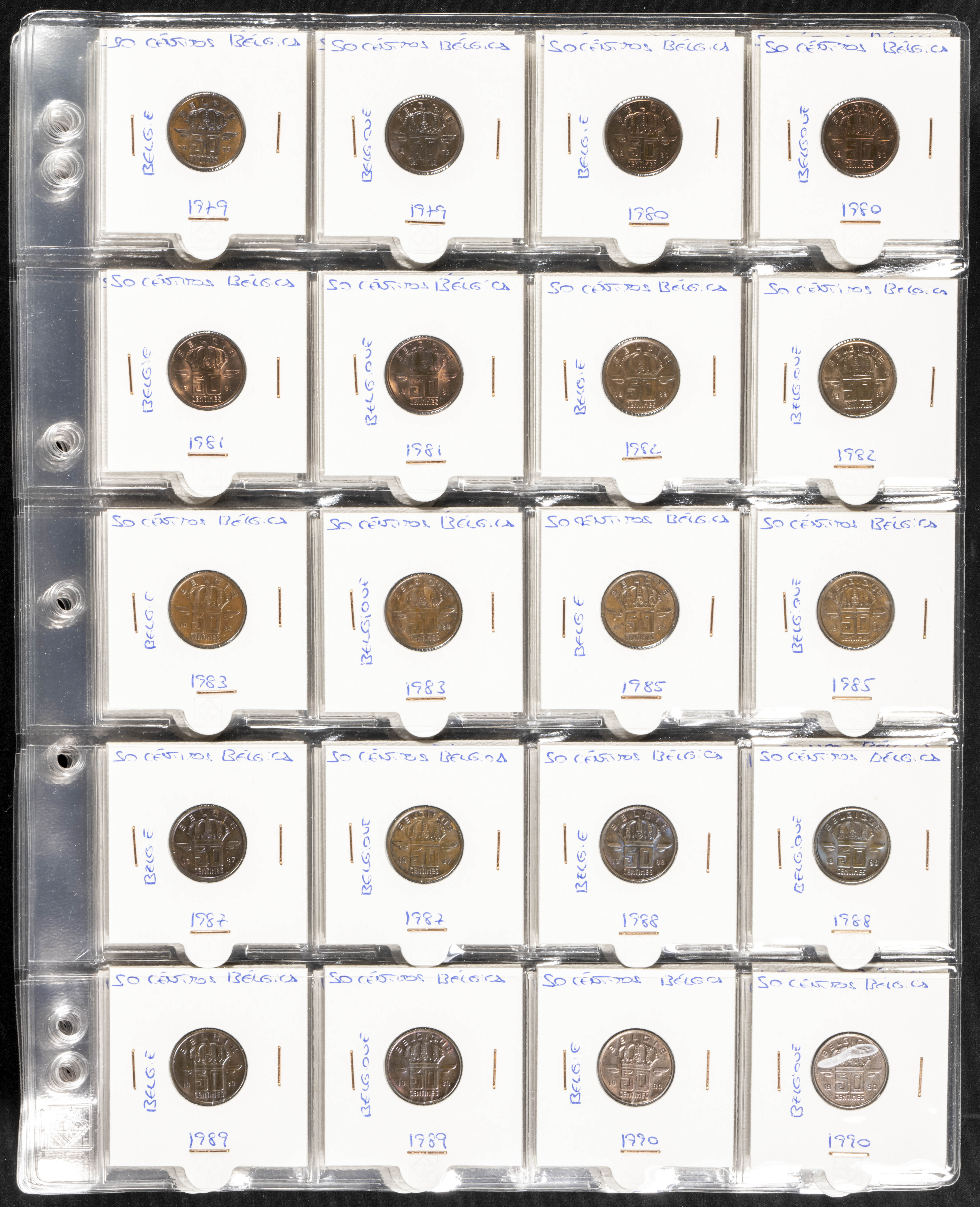BÉLGICA. Amplia e interesante colección de alrededor de más de 400 monedas expuestas en un álbum y varios sets oficiales, con una gran variedad de módulos, fechas y materiales representados entre los que encontramos interesantes ejemplares en plata y algunas conmemorativas. La colección se desarrolla en el periodo comprendido entre 1953 y 2001 (Reinados de Balduino I y Alberto II), sin piezas repetidas y con leyendas en las mismas en francés y flamenco y comprende todas las monedas circulantes de esos años (incluídos sets de monedas y plata circulante). Alto nivel de conservación general. A EXAMINAR.