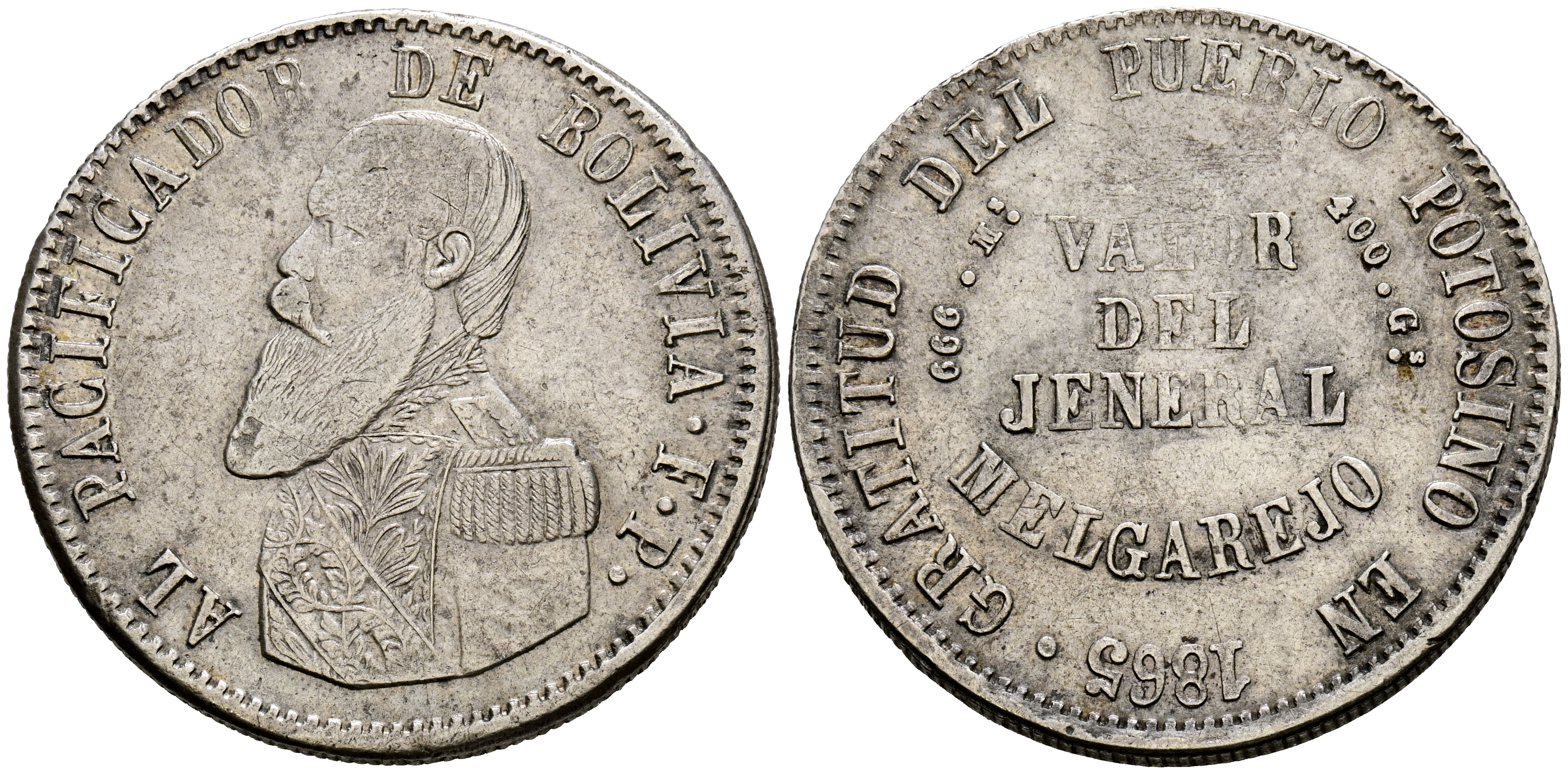 BOLIVIA. 1 Melgarejo. (Ar. 19,81g/36mm). 1865. Potosí FP. (Km#146). MBC. Escaso ejemplar.